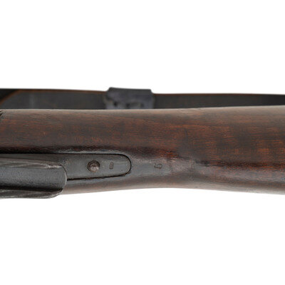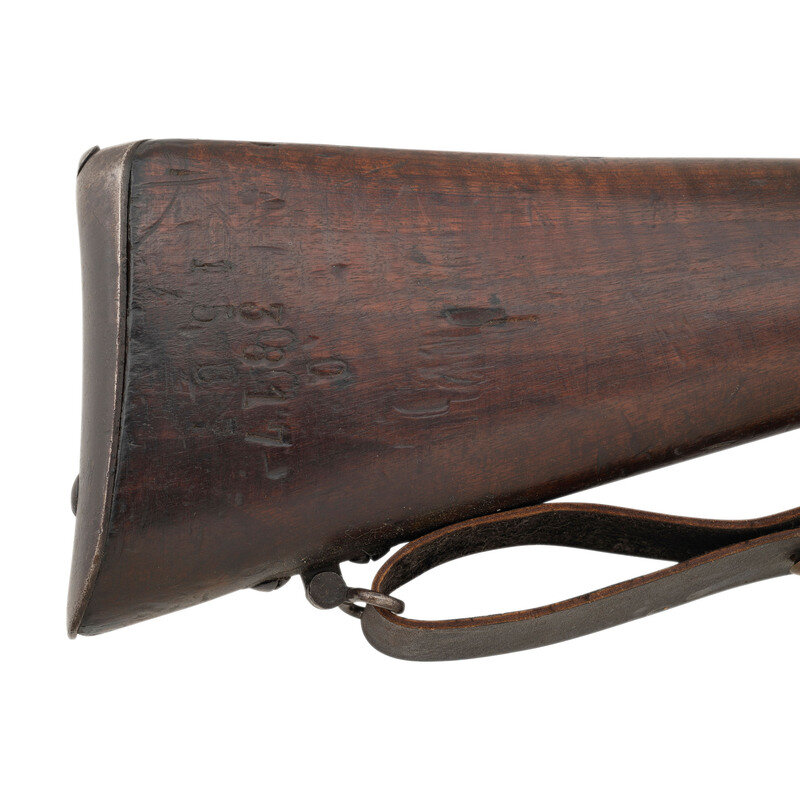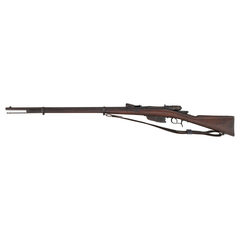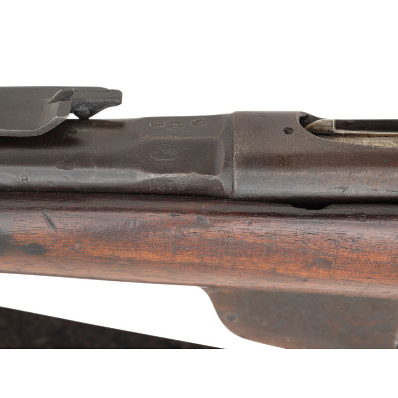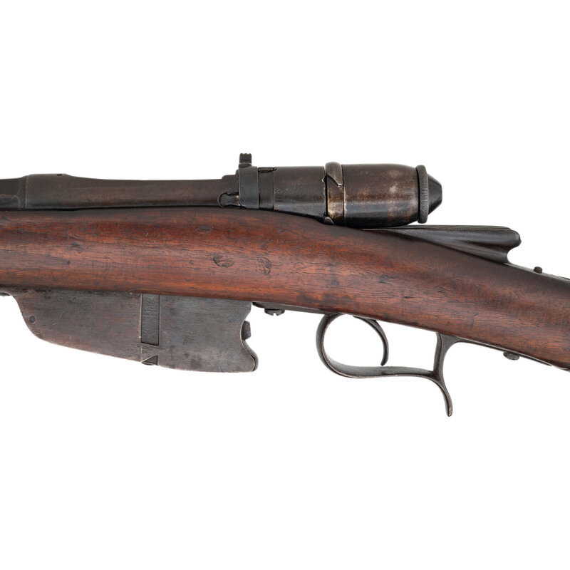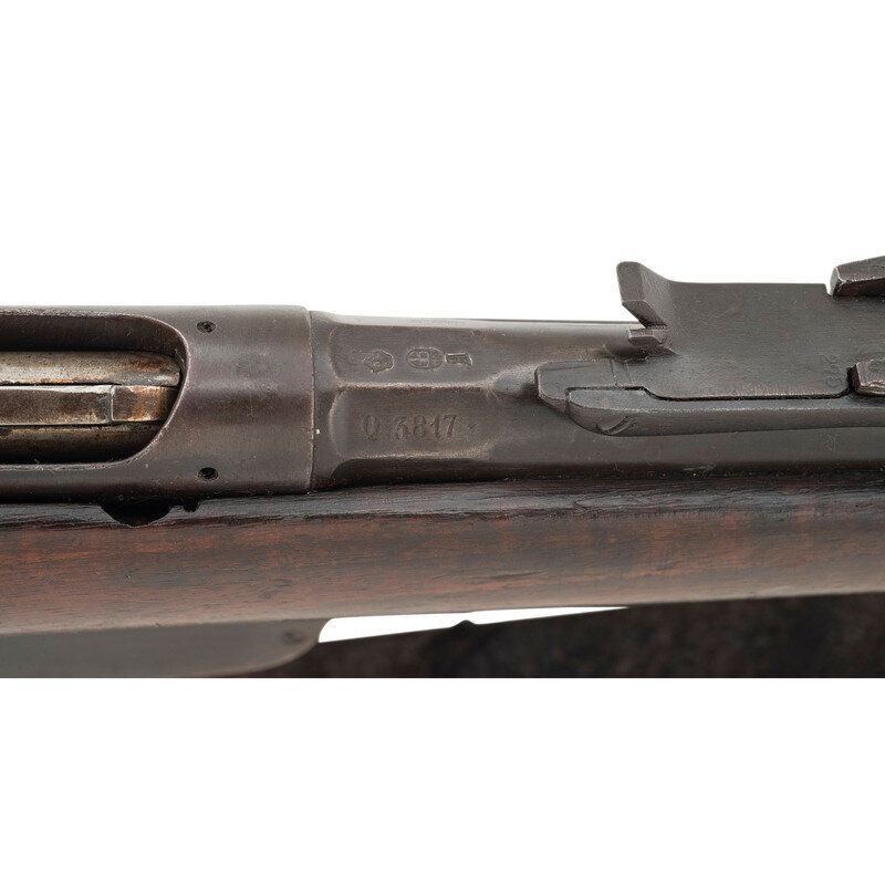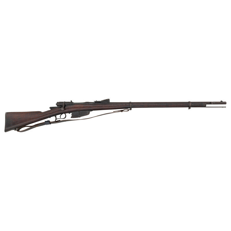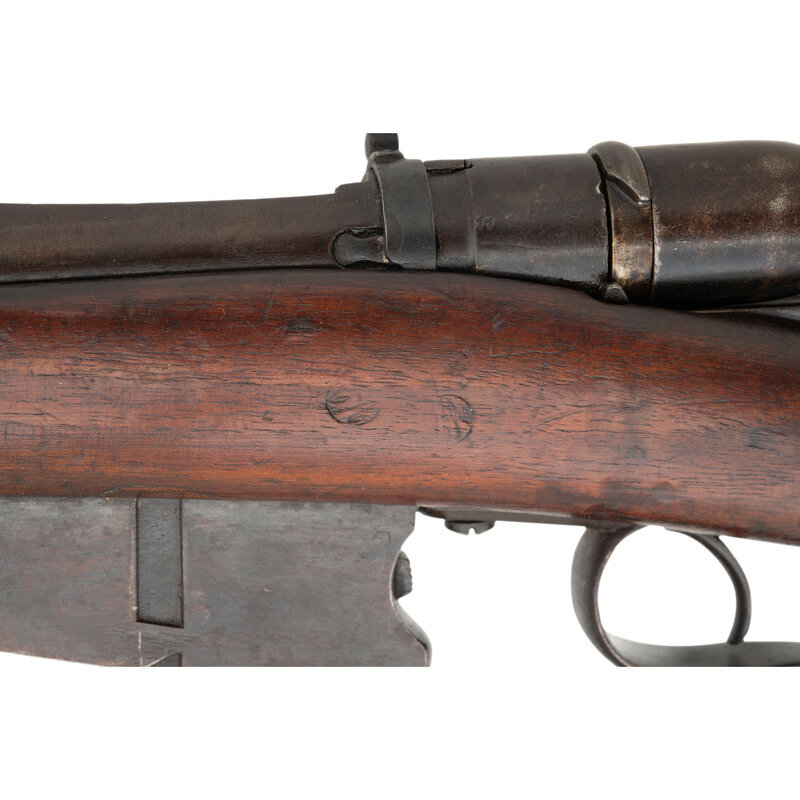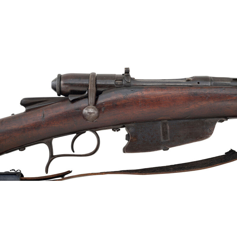 6.5x52mm. 33.85" barrel length. SN: Q3817. Blued metal finish with walnut straight wrist stock and mounting adjustable rear V-notch leaf and front blade sights. Bolt-action internal magazine fed repeating rifle charged with en-bloc Mannlicher style clips. Rifle is struck with the circled BRESCIA factory marking and originally dated 1873. Stock serial number has been arsenal force matched. Comes with a modern production leather sling.