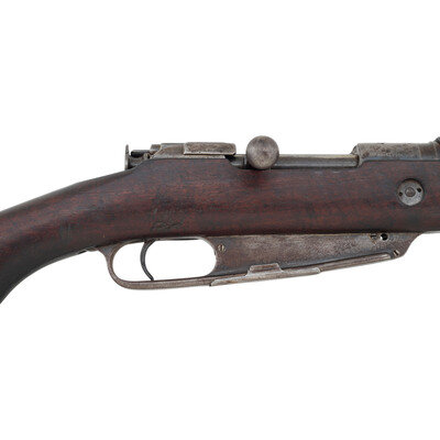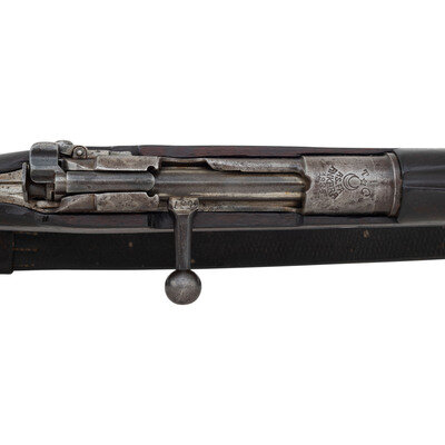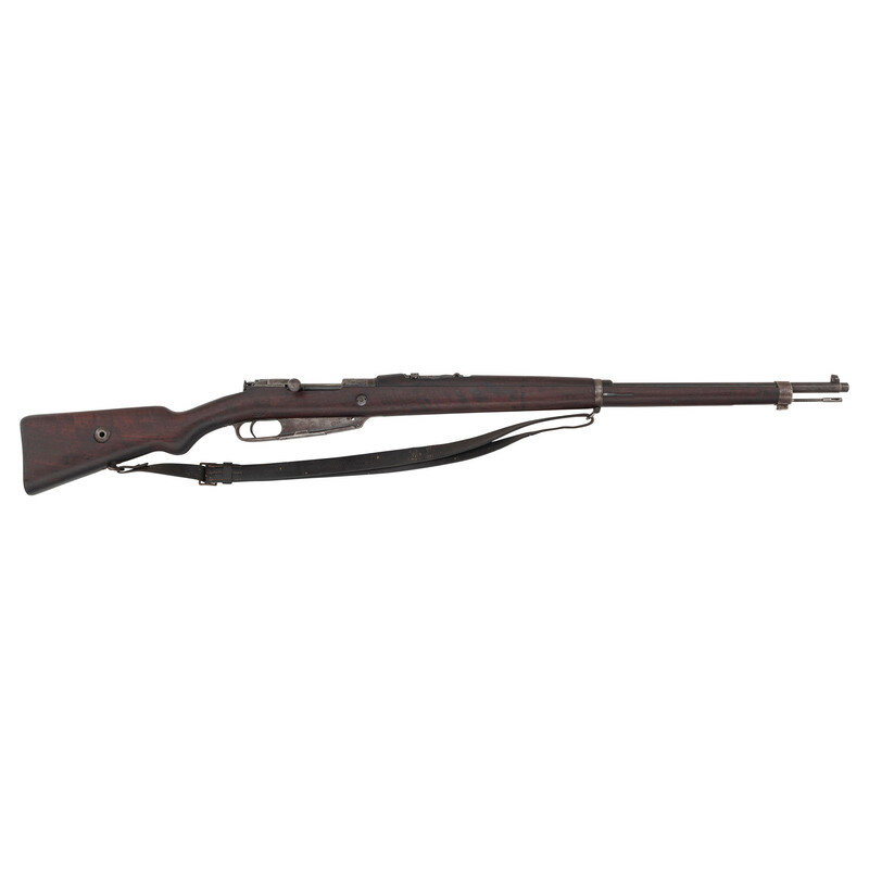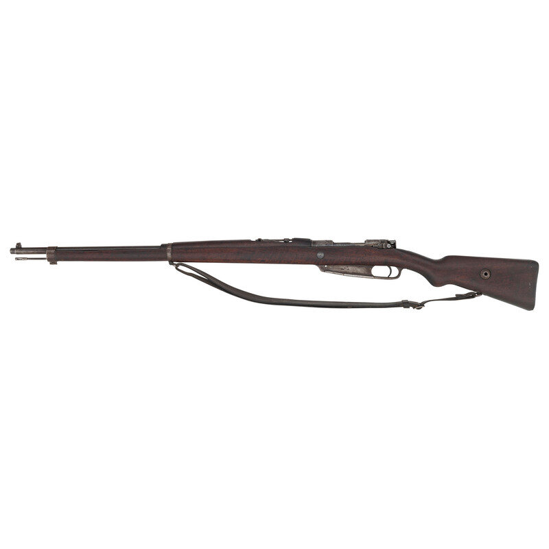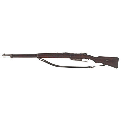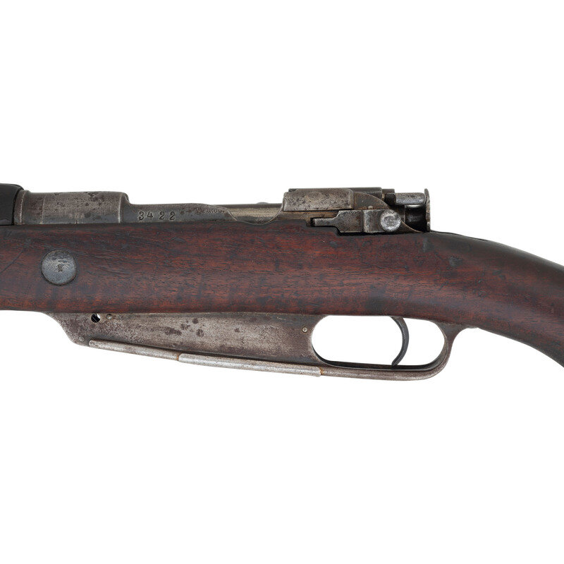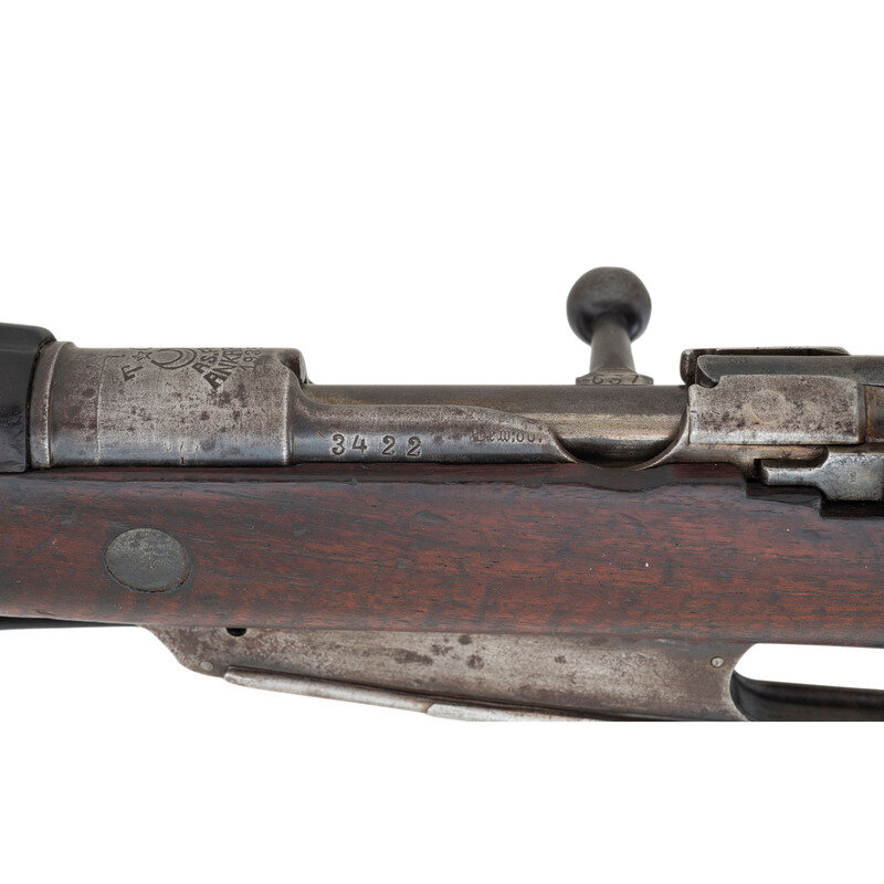 7.92x57mm. 29.1" barrel length. SN: 3422. Blued metal finish with walnut semi-pistol grip stock mounting half length upper handguard, stock disc to butt, and sling loops to the toe and barrel band. Bolt-action internal magazine fed repeating rifle charged with stripper clips. Item shows the Turkish {Crescent Moon} marking above AS-FA/ANKARA/1935, indicating this was one of the Gewehr 88 rifles rebuilt by Turkey to use standard Gewehr 98 style ammunition and stripper clips rather than the Mannlicher en block clips formerly employed. Left receiver features the loading cut, which partly obscures the original German Gew. 88 marking. Serial number of the bolt does not match. Comes with a leather sling. Importer mark applied to the right receiver.