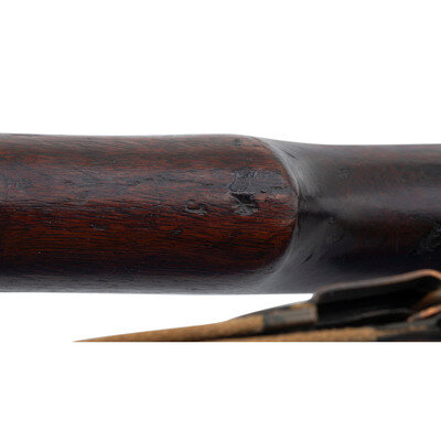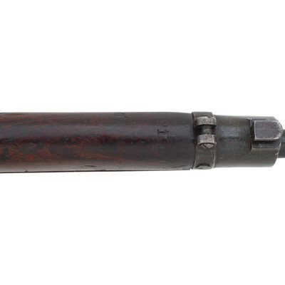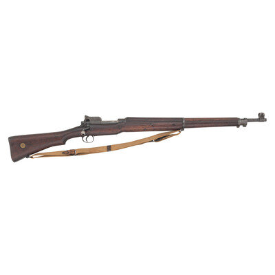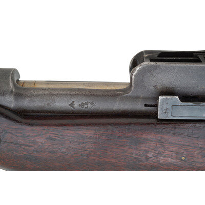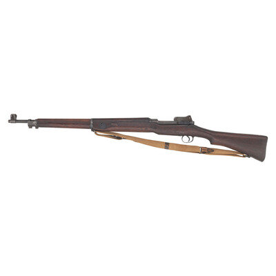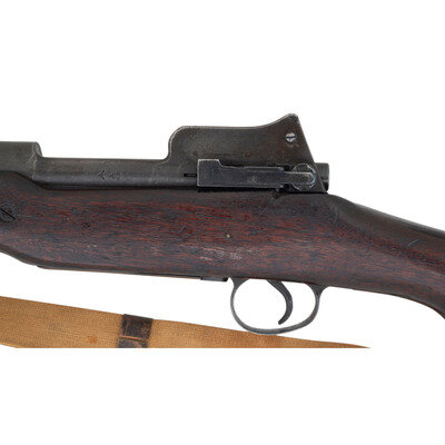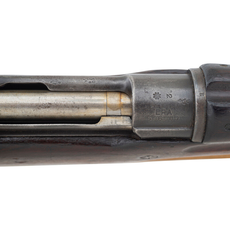 .303 British. 26" barrel length. SN: 506080. Blued metal finish. Walnut stock has a plain semi pistol grip and forearm, with grasping grooves and handguard. Bolt action rifle with an adjustable folding ladder peep rear sight and blade front sight with ear protectors. Item features an internal magazine, double sling swivels, bayonet lug forend, and a trapdoor buttplate with cleaning kit. Marks include ERA and British proofs marks to receiver, and importer marks to right side of barrel. Includes a khaki web sling.