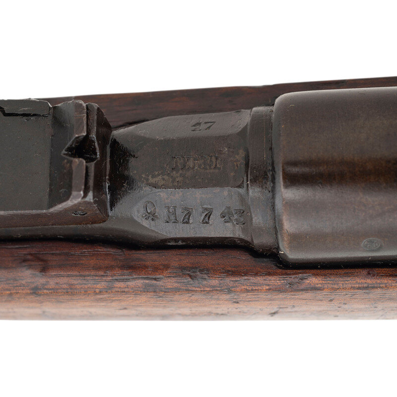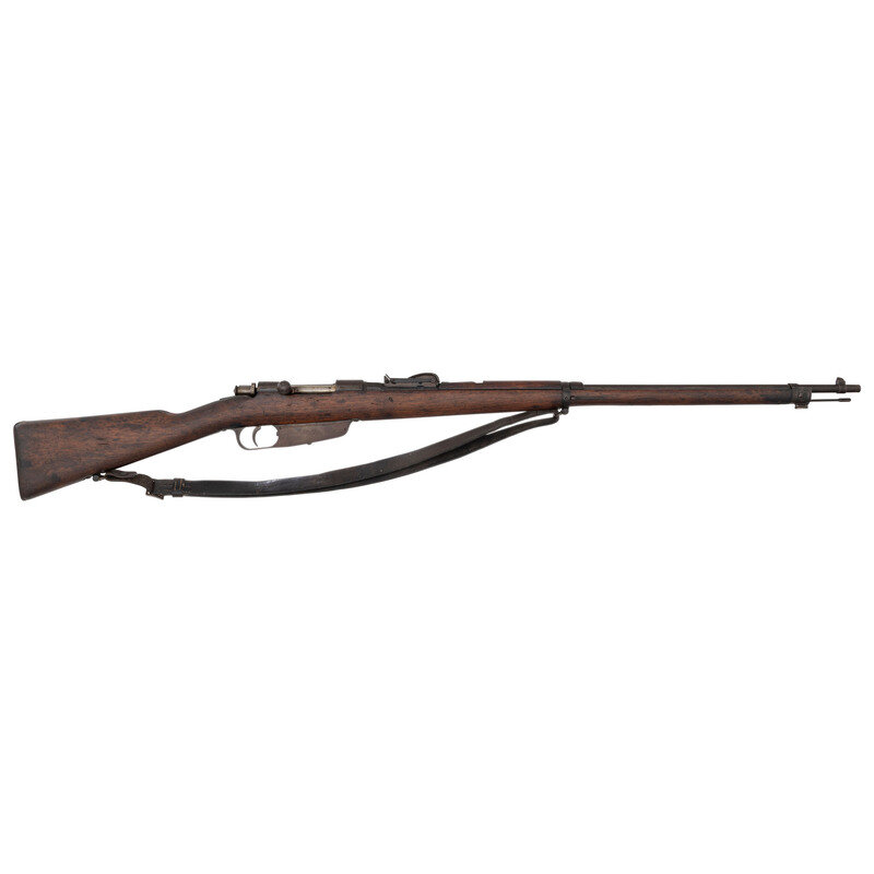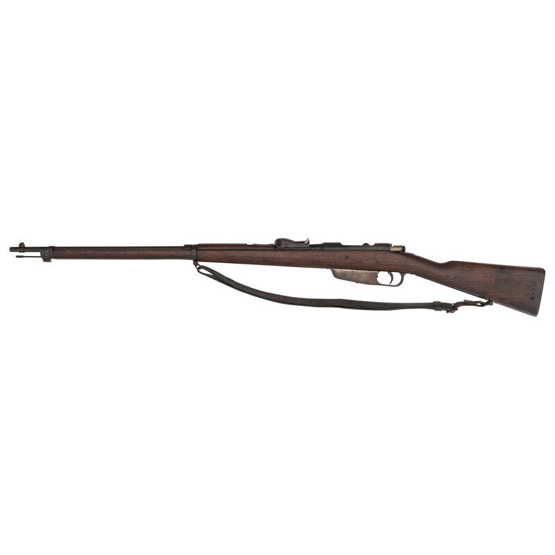 6.5x52mm. 30.7" barrel length. SN: QH7743. Blued metal arsenal refinish with polished bolt set in a walnut straight wrist stock mounting adjustable rear leaf notch and front blade sights. Bolt-action repeating rifle fed by an internal box magazine charged with en-bloc clips. Manufacturer markings to the breech octagonal include the maker TERNI to the top, serial number to the left, and a date mark of 17, indicating the rifle was made in 1917. Further markings to the left stock include a stamp to the left receiver reading OFF. COST. ART/ROMA/RIPARAZIONE with a date of 1926, indicating the rifle was rebuilt in 1926. Stock serial number has been force matched to the rifle. Left side of the stock shows two ME inspection stamps and has the dates 1918 and 1917 scratched into the stock forward of and behind the wrist. Comes with a leather sling