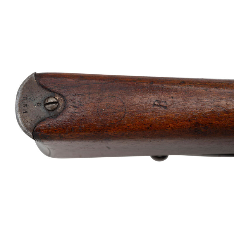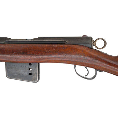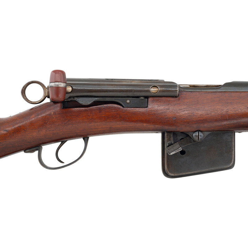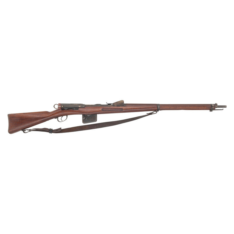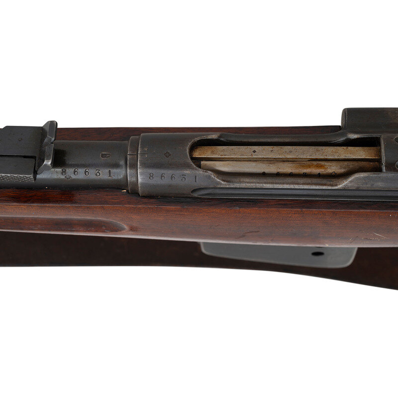 7.5x53.5mm Swiss. 31" barrel length. SN: 86631. Blued metal finish. Full length walnut stock has a plain straight grip and forearm, with grasping grooves and handguard. Straight pull bolt action rifle with an adjustable tangent notch rear sight and blade front sight. Item features a removable 12-round magazine, double sling swivels, parry hook, and bayonet lug forend. Includes a brown leather sling.