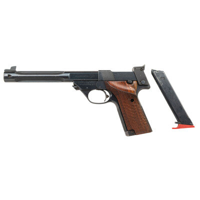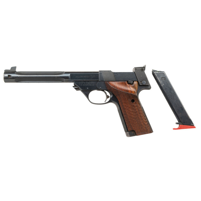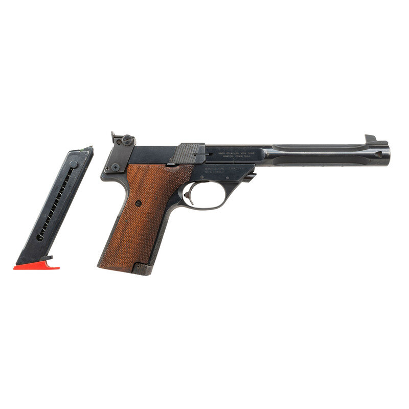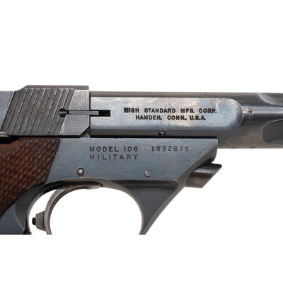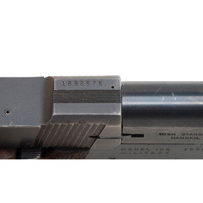 .22 LR. 7.25" barrel length. SN: 1892675. Blued metal finish with case colored trigger and magazine release, checkered walnut thumb rest grips, and a fluted barrel. Simple blowback operated internal hammer fired autoloading pistol fed by detachable single stack magazines. Muzzle shows the mounting cuts used for installing a muzzle brake (not included), with underside of barrel drilled and tapped for installing weights. Sights consist of a fully adjustable target rear notch affixed to the frame, and a Patridge front blade sight. Left frame marked SUPERMATIC/CITATION with left slide struck HIGH/STANDARD and standard caliber mark on the left barrel. Right barrel is marked HIGH STANDARD MFG. CORP./HAMDEN, CONN. U.S.A. with the right frame marked MODEL 106/MILITARY. Item comes with one extra magazine, and comes in a black nylon soft case with a patch for the ASSOCIATION OF RIFLE & PISTOL CLUBS NEW JERSEY.