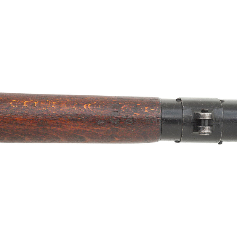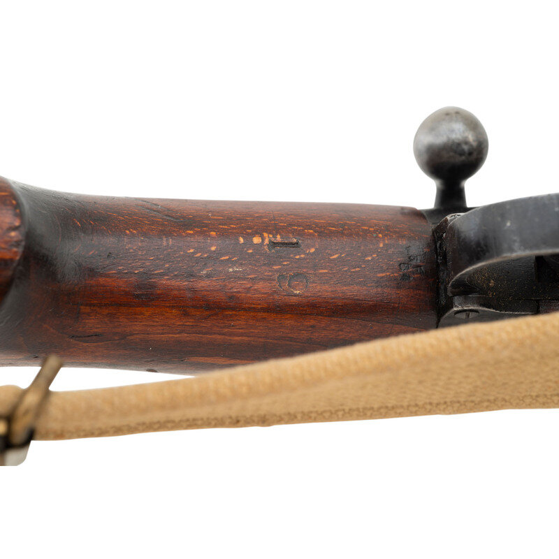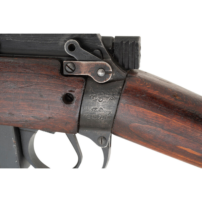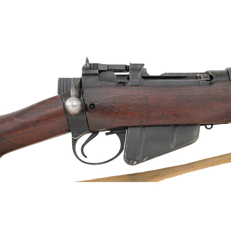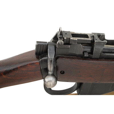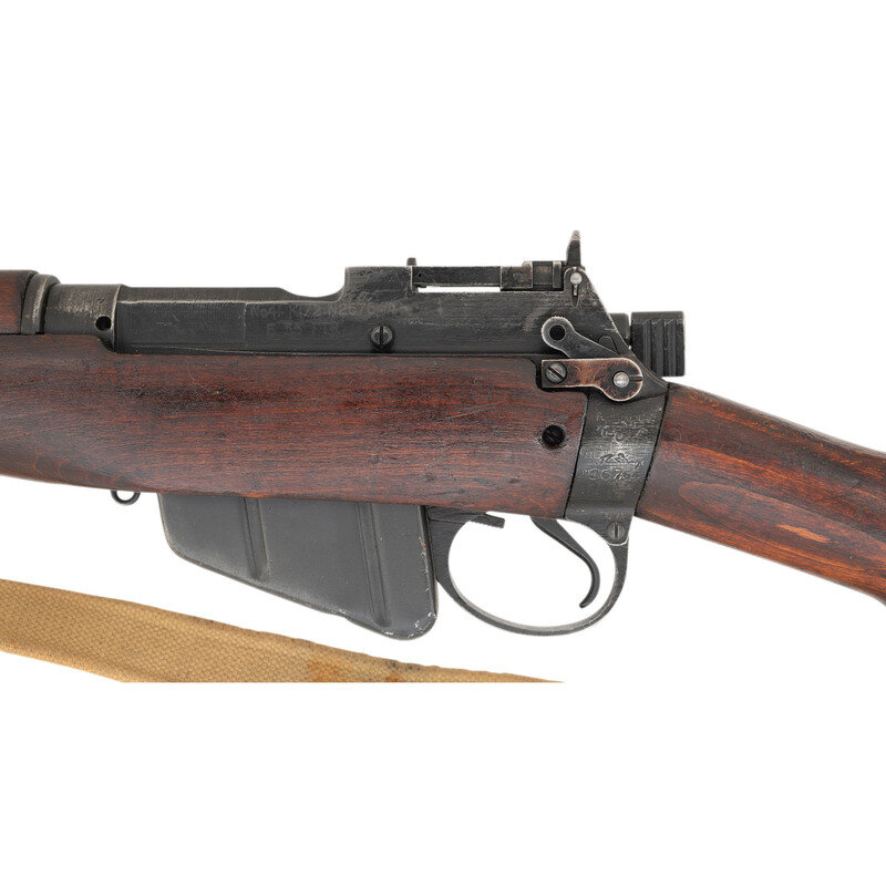 .303 British. 25.2" barrel length. SN: N26764A. Black Suncorite refinish overall with oil finished walnut semi-pistol grip stock mounting full length upper handguard with brass buttplate and mounting adjustable ladder rear aperture and front blade sights, the latter with a protector. Bolt-action internal magazine fed repeating rifle fed by semi-detachable box magazines charged with stripper clips. Left receiver is marked No4 MKI/2 followed by E. 55 FTR, indicating the rifle has been through the British "Factory Through Repair" system. Stock ring is marked ROF above misaligned 42 date marking. Importer mark reads VAC ALEX. VA. Comes with a {Broad Arrow} marked khaki sling.