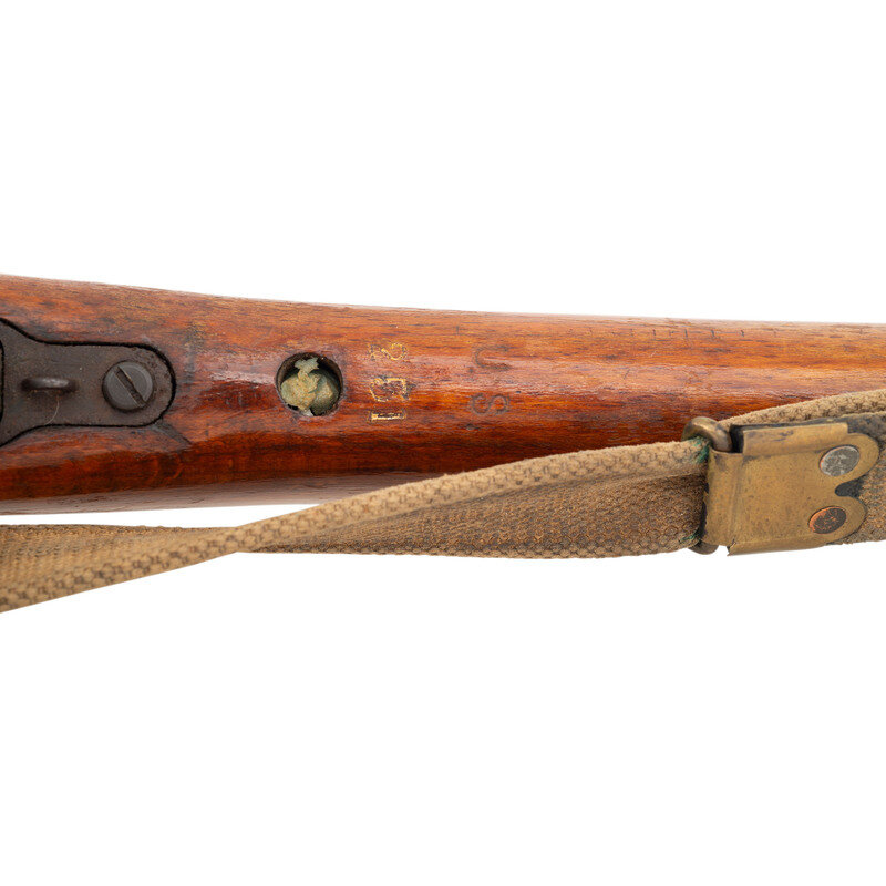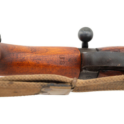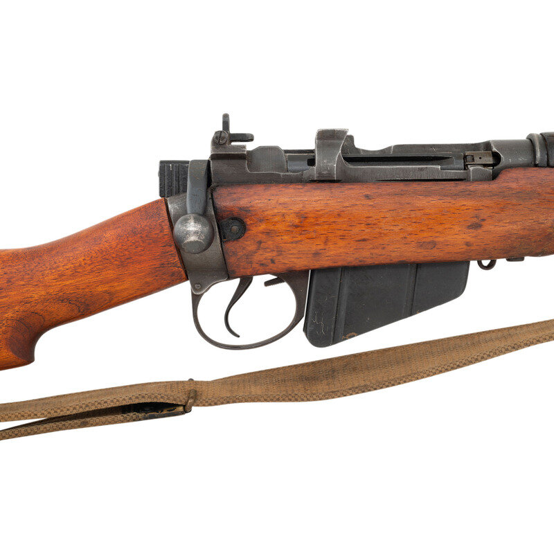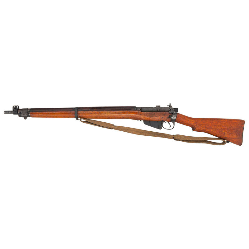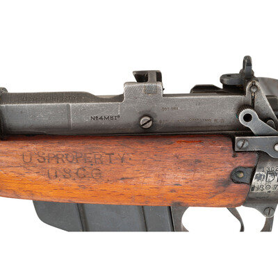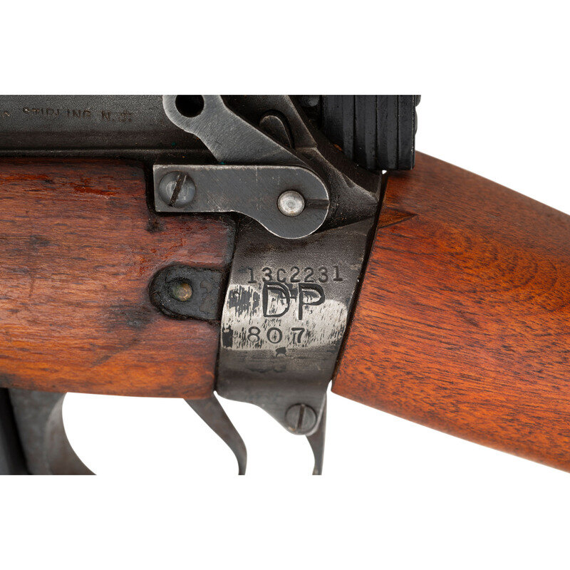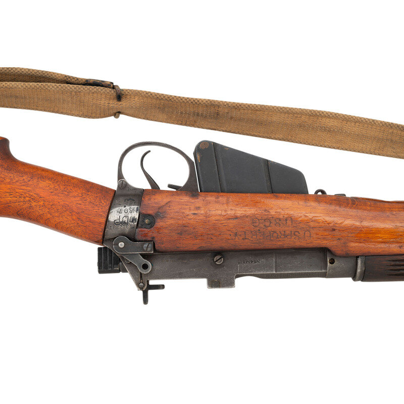 .303 British. 25.2" barrel length. SN: 13C2231. Black Suncorite finish with polished bolt body set in a Walnut semi-pistol grip stock and mounting two-position rear notch and front blade sights with protectors. Bolt-action rifle semi-detachable magazine fed repeating rifle charged with stripper clips and mounting a steel buttplate. Left receiver struck with model marking NO 4 MKI* with further marks to the stock ring reading DP/807. Left receiver flat is struck U.S. PROPERTY with left stock marked US PROPERTY/U.S.C.G. A further DP is marked onto the bolt handle in electropen. Serial numbers match on bolt handle and receiver, but the magazine does not. Forend appears to have been varnished. Wrist is struck US, and the rifle shows no Commonwealth markings. Barrel features two-groove rifling. Comes with a British pattern canvas sling featuring {Broad Arrow} stamp.