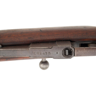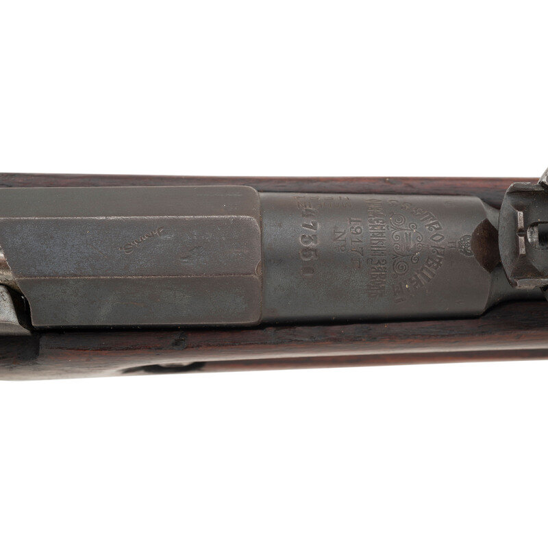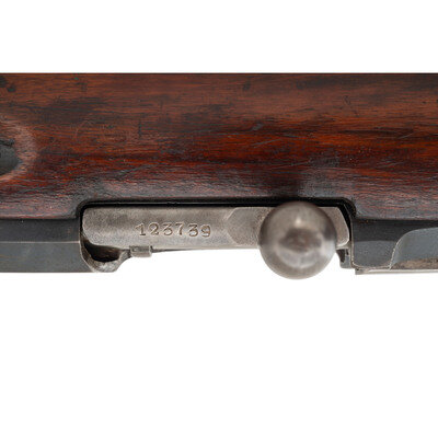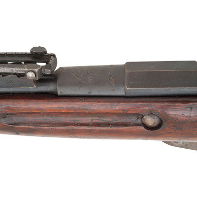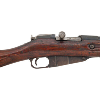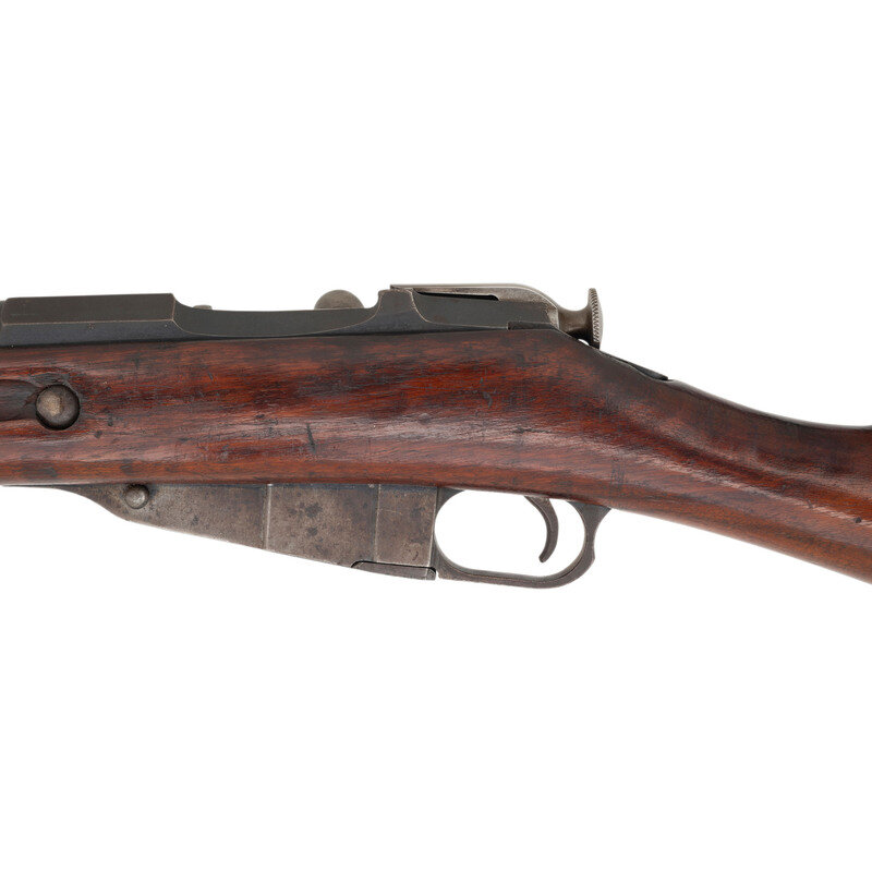 7.62x54mmR. 31.5" barrel length. SN: 47350. Blued metal finish with polished bolt set in a varnished birchwood stock with escutcheons to the sling cuts and Konavolov pattern rear ladder and front blade sights. Bolt-action internal magazine fed repeating rifle charged with stripper clips. Barrel shank shows the {Imperial Russian Eagle} above the markings of the Russian Sestoresk Arsenal where it was made, and a date of production of 1917. Rifle shows scattered inspection stamps to major parts. Serial numbers do not match. Upper receiver flat is marked U.R.R.S., an export marking typically seen on Mosin Nagant rifles exported as aid to Spain during the Spanish Civil War. Left receiver further marked MADE IN/USSR applied before export to the United States. Tang struck with a boxed M marking.