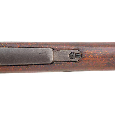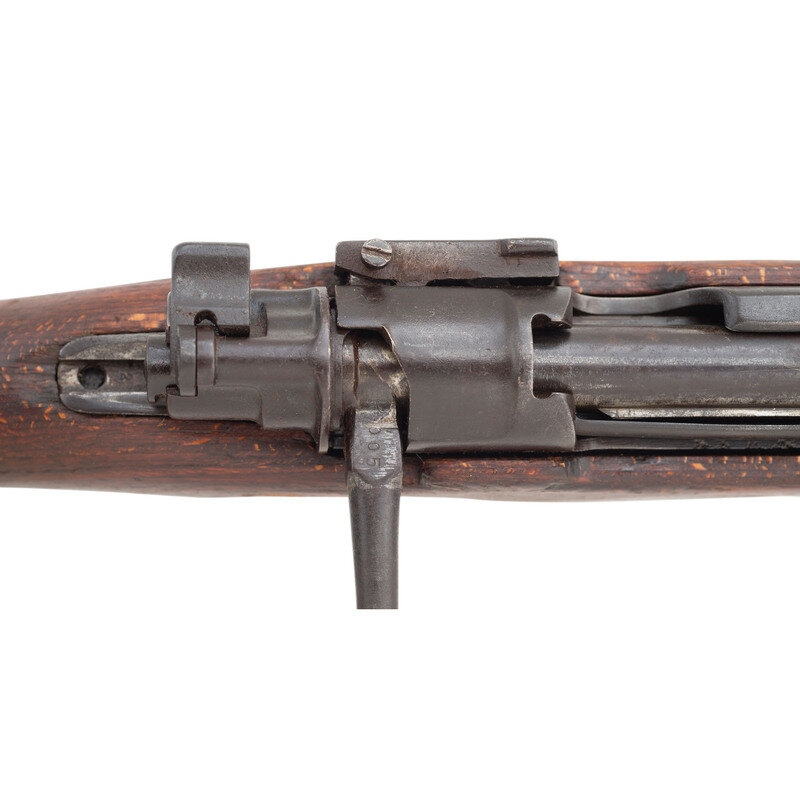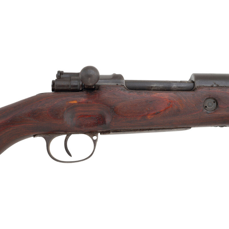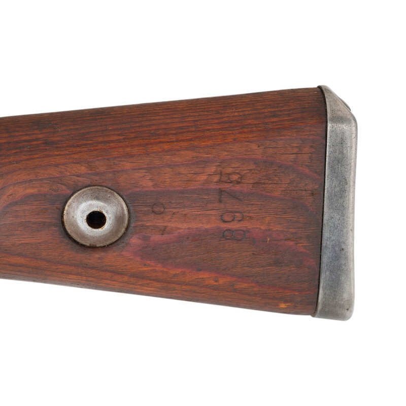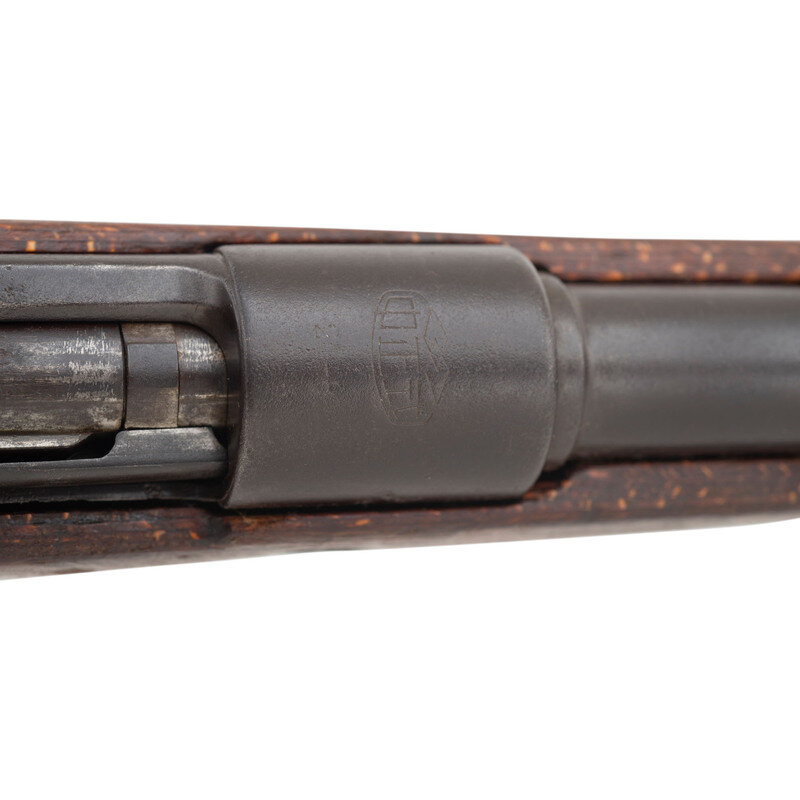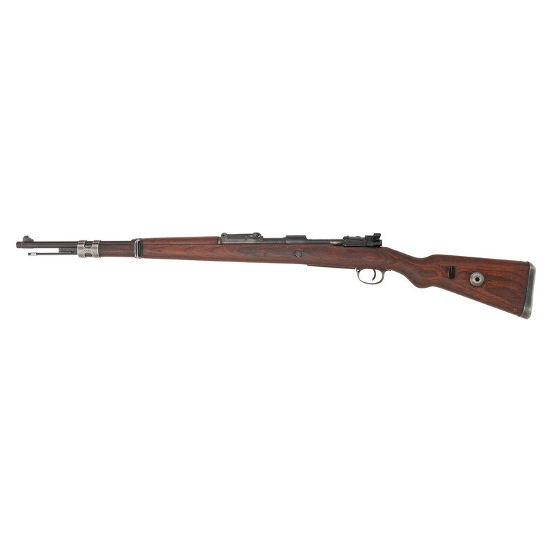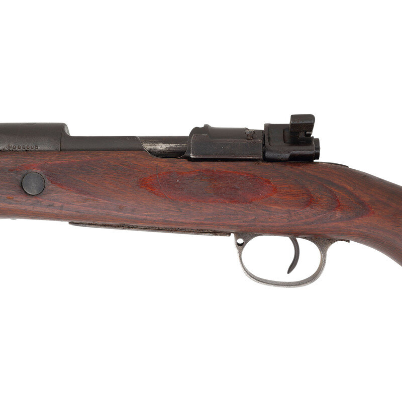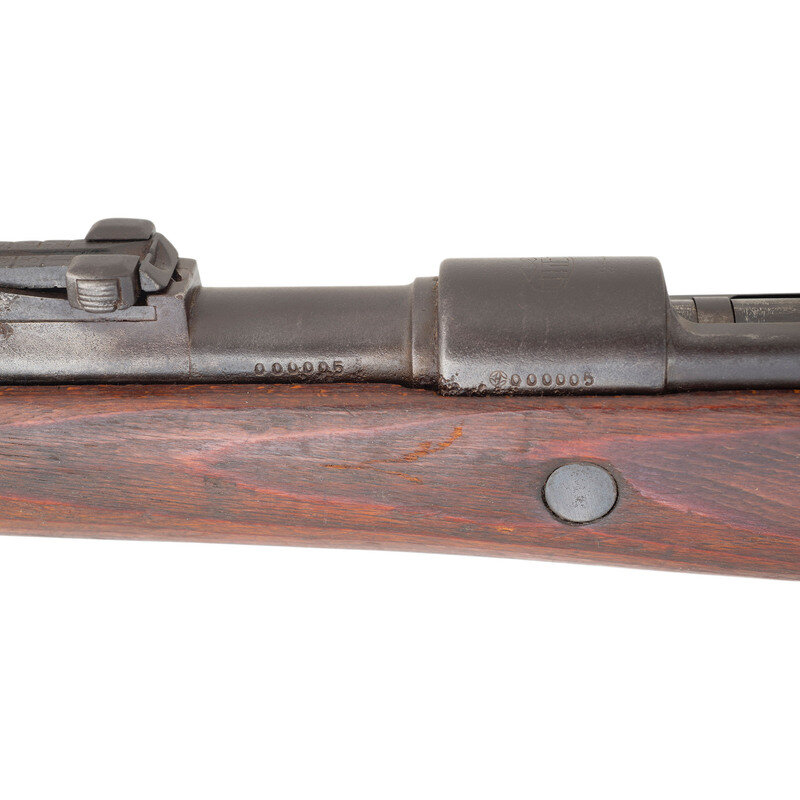 7.92x57mm Mauser. 24" barrel length. SN: 000005. Blued military finish. Hardwood stock has a plain semi pistol grip and forearm, with handguard and grasping grooves. Bolt action rifle with an adjustable tangent notch rear sight and blade front sight. Item features an internal magazine, double sling swivels, side mount sling loops, cupped steel buttplate, and a bayonet lug forend. Markings include arsenal and weak date markings to receiver. Stock has a mismatched serial or rack number to left side.