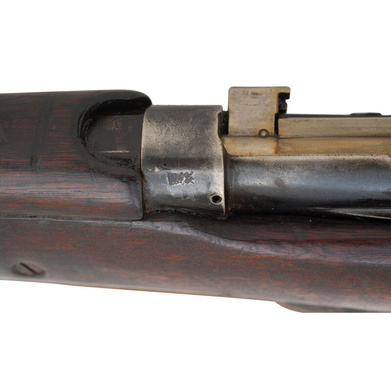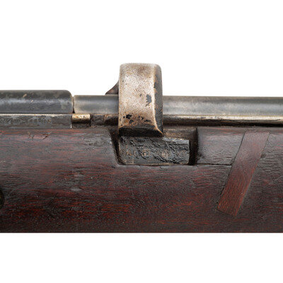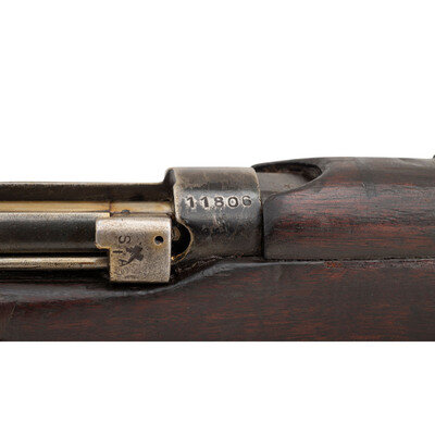 .303 British. 25" barrel length. SN: 11806. Blued metal finish with traces of Suncorite black paint. Walnut stock has a plain semi pistol grip and forearm, with handguard and two sections of wire wrapping. Bolt action rifle with an adjustable tangent notch rear sight and blade front sight with ear protector lug. Item features a removable magazine, double sling swivels, bayonet lug forend, and a trapdoor brass buttplate void of contents. Markings include RFI/1952 marks to wrist band, importer marks to action, obscured cartouches to right side of stock, and a painted rack number 3 to left side of butt. Includes a khaki sling.