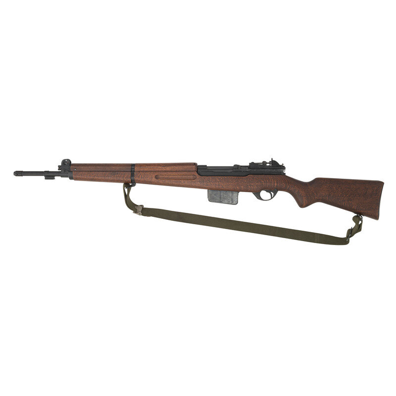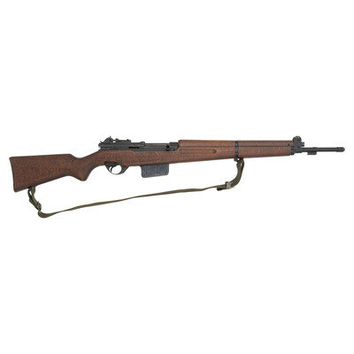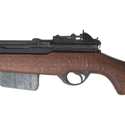 7.92x57mm Mauser. 23" barrel length. SN: D11437. Black metal finish. Walnut stock has a plain semi pistol grip and forearm, with grasping grooves and handguard. Semi automatic rifle with adjustable tangent peep rear sight and red painted blade front blade with ear protectors. Item features a removable magazine, double sling swivels, and a bayonet lug forend. Markings include Eagle of Saladin crest as well as Farsi text to receiver, and importer marks to right of barrel. Includes an OD sling.
