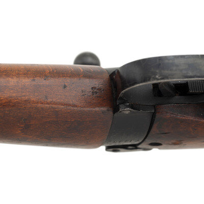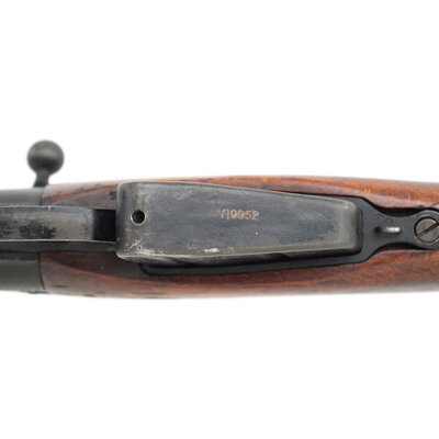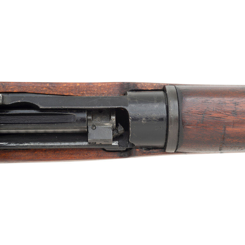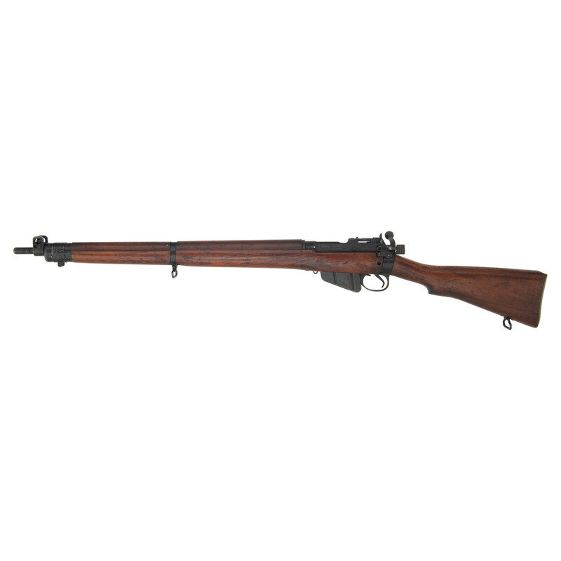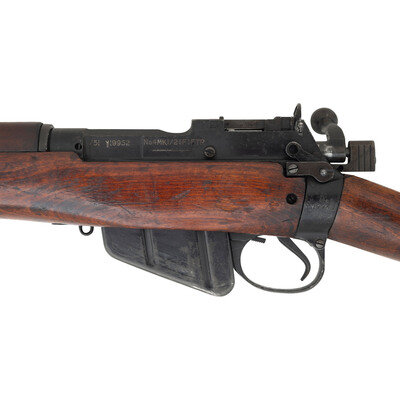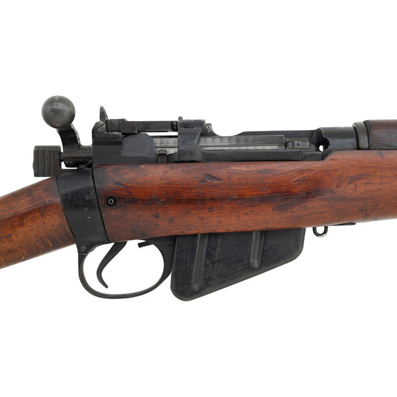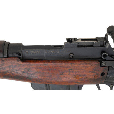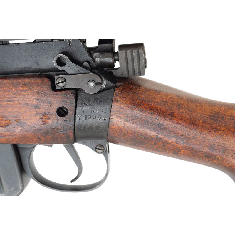 .303 British. 25" barrel length. SN: Y19952. Black Suncorite finish. Semi pistol grip walnut stock with handguard. Bolt action rifle with an adjustable folding ladder peep rear sight and blade front sight with ear protectors and fluorescent orange paint. Item features a removable magazine, double sling swivels, bayonet lug muzzle, and brass trapdoor buttplate void of contents. Markings include NO4MKI/2 (F)FTR to left of receiver, importer marks and British proofs, as well as a 1942 date.