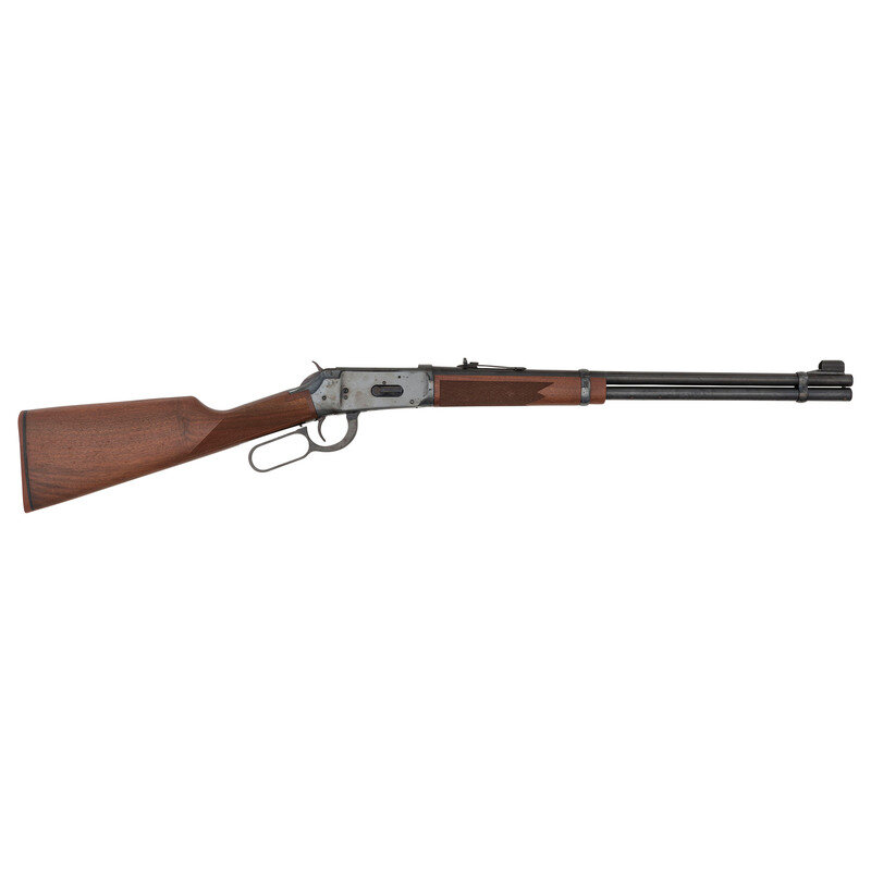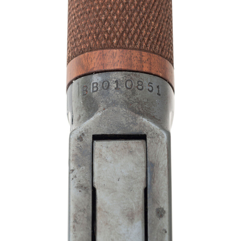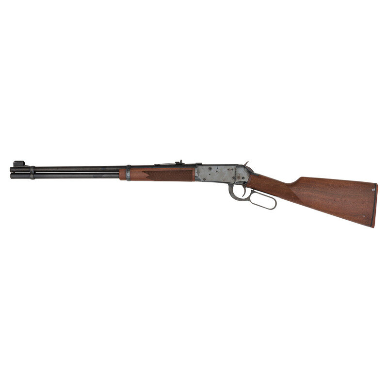 .375 Winchester. 20" barrel length. SN: BB010851. Blued metal finish overall with straight-wrist walnut stock featuring bordered checkering to the wrist and forend, and mounting adjustable semi-buckhorn rear and fully hooded front bead sights. Lever-action repeating rifle fed by a full length tube magazine. Standard make and model markings struck into the left barrel. Stock mounts a Winchester marked rubber recoil pad.