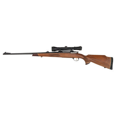 .30-06. 23.5" barrel length. SN: P-8961. Blued metal finish with jeweled bolt set in a walnut Monte-Carlo style stock with rosewood forend and pistol grip caps, rubber recoil pad, and white line spacers. Bolt-action internal magazine fed repeating rifle mounting a BAUSCH & LOMB dovetail scope base fitted with a Lyman 3-9X scope. Rifle mounts an adjustable WILLIAMS rear notch and matted front ramp sights. Additionally features front and rear sling swivels, a gold trigger, and skip line checkering to the wrist and forend. British firing proofs struck into the barrel and receiver with the right barrel marked FIREARMS CO ENGLAND and the left showing A.D. HELLER INC. BALDWIN. N.Y.
