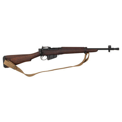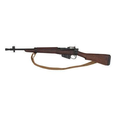 .303 British. 20.5" barrel length (with flash eliminator). SN: DD0257. Black Suncorite finish overall set in a walnut semi-pistol grip stock mounting rubber recoil pad to buttplate with integrated sling loop to right side. Bolt-action semi-detachable magazine fed repeating rifle charged with stripper clips. Left receiver is marked No.5.Mk.I. with the rear receiver ring marked on the left side M/47C/1945, indicating it was made by BSA in 1945. Receiver and barrel both display the lightening cuts indicative of the No 5 Jungle carbine. Rear barrel shows a second M47C marking, a third on the forend behind the barrel band, and scattered {Broad Arrow} marks are struck into various components. Serial numbers match on the receiver, forend, and bolt handle. Importer mark to the right receiver reads 303 cal ENG/E-W ML/FRASER MI. Comes with a 1948 dated and broad arrow proofed canvas sling.