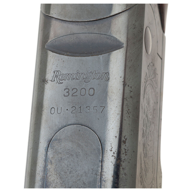12 Gauge. 29.875" barrel length. SN: OU21357. 2.75" chamber lengths. Full choke to upper barrel and Improved Modified to lower. Blued metal finish set in polished Walnut Monte-Carlo style stock with Remington marked recoil pad and a full length raised vented rib. Break-action over under double barrel boxlock ejector shotgun. Flanks of the frame are engraved with vignettes of {Pointers} within floral borders. Item shows standard make and model markings, including SPECIAL TRAP mark to the left barrel.