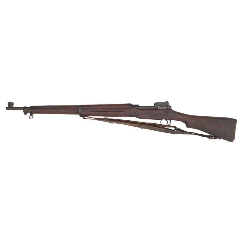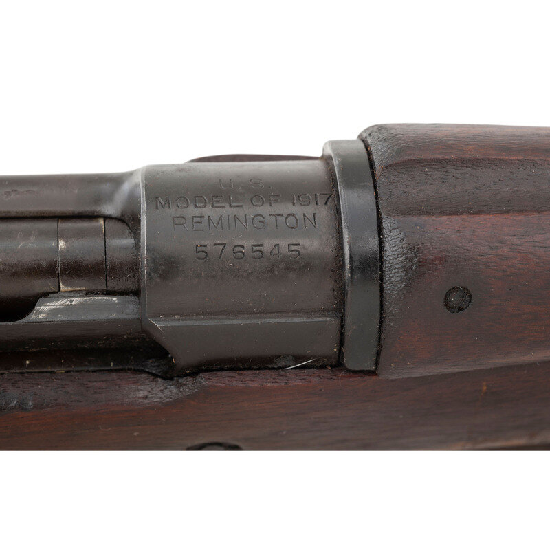 .30-06. 26" barrel length. SN: 576545. Parkerized metal refinish with walnut semi-pistol grip stock, full length upper handguard, and mounting ladder rear aperture and front blade sights with protectors. Bolt-action internal magazine fed repeating rifle featuring a cock-on-close action. Receiver is struck with the maker markings U.S./MODEL OF 1917/REMINGTON with the barrel marked R/{Ordnance Bomb}/9-18. Left receiver is struck with a second {Ordnance Bomb} marking. Left stock struck with boxed RA-P mark, indicating it was rebuilt by the Raritan Arsenal, followed by a boxed 3GM-K marking. Wrist is struck with the initial K followed by {Eagle Head/72} US inspection marking. Comes with a leather pattern of 1907 sling.
