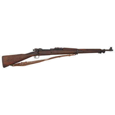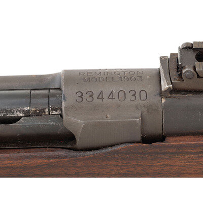 .30-06. 24" barrel length. SN: 3344030. Parkerized metal finish with milled small parts and mounting adjustable rear ladder notch and pinned front blade sight with protector set in a straight wrist Walnut stock. Bolt-action repeating rifle fed by an internal box magazine charged with stripper clips. Receiver is marked U.S./REMINGTON/MODEL 1903 with the barrel marked RA/{Ordnance Bomb}/12-42, indicating the barrel was marked in December, 1942, while the serial number indicates the rifle was completed in January, 1943. Counterpane is struck RA, indicating it was made by Remington Arms, followed by the {Crossed Cannons} ordnance mark and boxed FJA initials of Lieutenant Colonel Frank J. Atwood, the commander of the Rochester Ordnance District. Stock further shows circle P mark to the wrist with an additional P pressure proof stamp on the barrel. Barrel shows the early pattern of four-groove rifling that Remington produced 1903 rifles with before switching to simpler two-groove. Top of the forend struck with number D28179, a parts number indicating this was a replacement forend. Comes with a reproduction leather Pattern 1907 sling. Rear edge of the magazine follower has been cut down to prevent the stop from engaging.