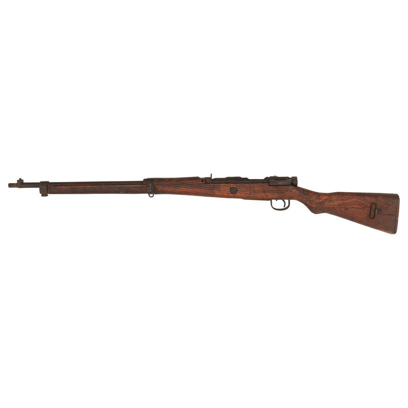 7.7x58mm. 25.9" barrel length. SN: 59350. Blued metal finish over rough machined and forged parts set in roughly finished semi-pistol grip stock with spliced toe and wood buttplate retained by nails. Bolt action repeating rifle fed by an internal box magazine charged with stripper clips and mounting fixed rear aperture and barleycorn front blade sights. Left receiver displays the marking for {Howa Jyuko} manufacture beside a {9th Series} marking. Top of the receiver is struck with the standard Japanese kanji markings for Type 99 below a ground off Chrysanthemum. Serial numbers match on the receiver, bolt, cocking knob, and firing pin.