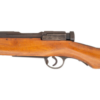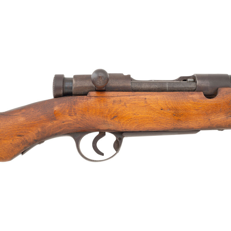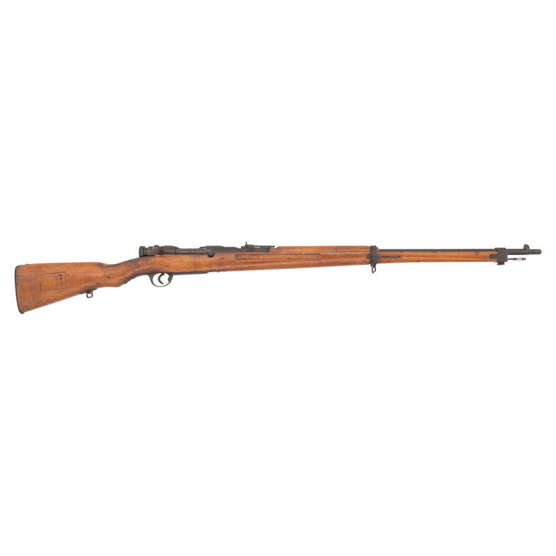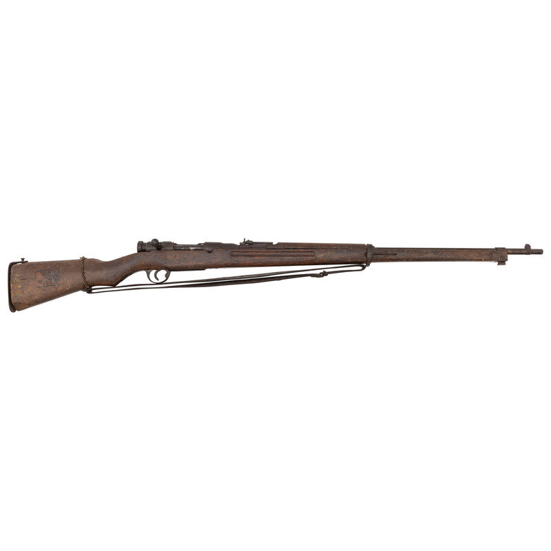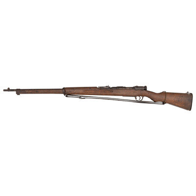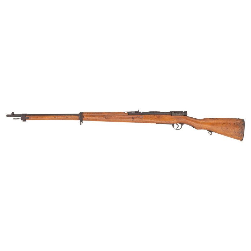 1.) 6.5x50mm blank rounds. 31.5" barrel length. SN: 16295. Blued metal finish set in a walnut semi-pistol grip stock mounting adjustable aperture rear and barleycorn front blade sights. Bolt action smoothbore repeating trainer rifle built using an Arisaka Type 38 action. Receiver ring is struck with the {Anchor and Sakura} symbol of the Imperial Japanese navy with further inventory markings on the stock and a leather sling.
