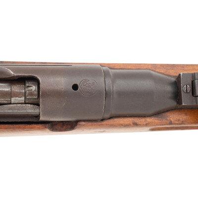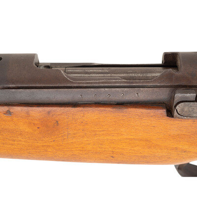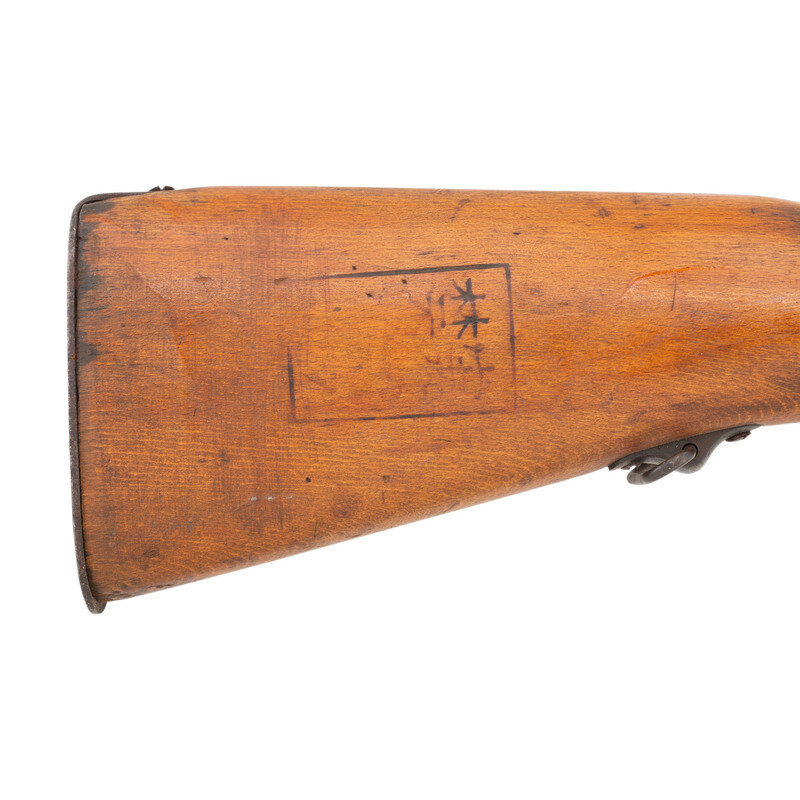 2.) 6.5x50mm blank rounds. 31.5" barrel length. SN: 16221. Blued military finish. Hardwood stock has a plain semi pistol grip and forearm, with grasping grooves and handguard. Bolt action rifle with an adjustable folding ladder peep rear sight and blade front sight. Item features an internal box magazine, double sling swivels, bayonet lug forend, and a slotted head cleaning rod. Markings include Imperial Japanese {Anchor and Sakura} crest marked to receiver. Stock is marked with boxed kanji on right side of butt, and circled kanji on left side. This rifle is smoothbore and meant to fire training rounds only.