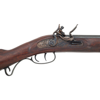 .54 caliber. 33" wedge retained octagonal barrel. SN: A467564. Blued finish, color casehardened flint lock, steel furniture, hardwood stock. Single shot muzzleloading flintlock rifle in the style of a Hawken plains rifle with a raised cheek rest, scroll triggerguard, double set triggers, semi-buckhorn rear sight, dovetailed Rocky Mountain blade front sight and a metal tipped wooden ramrod.