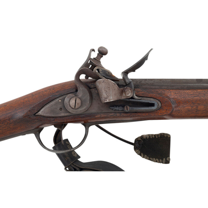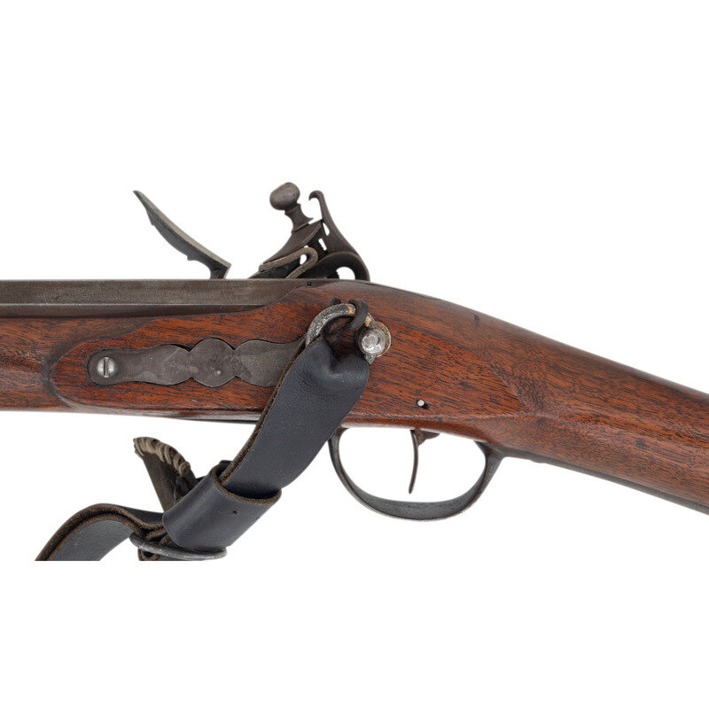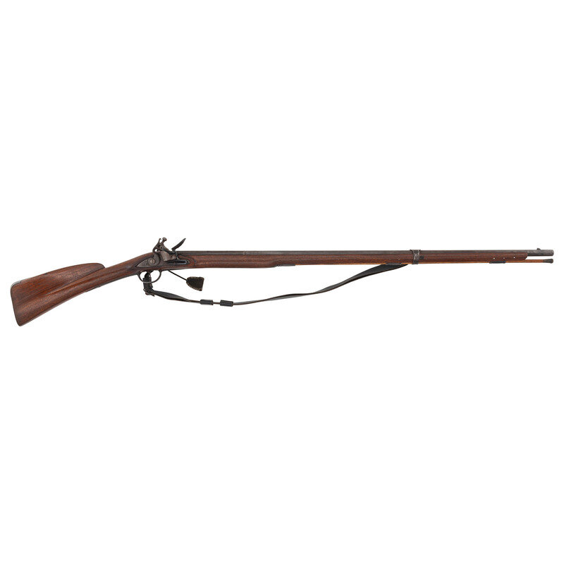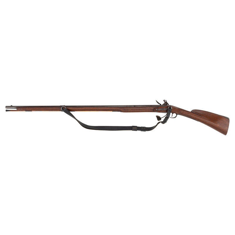 .62 caliber smoothbore. 41.25" octagon to round pinned barrel with single flat barrel band. NSN. Bright finish, iron furniture, hardwood stock. Single shot muzzleloading flintlock musket with a form that more closely follows the Fusil de Chasse than any identifiable French military pattern gun, with an attractive Roman-nosed stock profile. Unmarked, flash guard added to lock, sling rings mounted to the counterpane and a single barrel band similar to those on the French 1728 series of arms. No markings on gun. A tag applied by consignor reads "French Grenadier .62 - 590Rb Built by Bill Douglas AKA Sweet William, 2003." Included a brass tipped wooden ramrod and a reproduction sling.