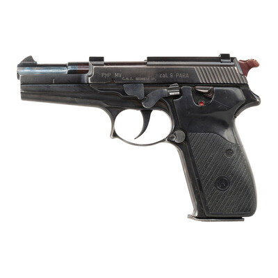 9mm Para. 4.1" barrel length. SN: 10979. Blued metal finish overall with plum blued hammer and mounting black synthetic grips with pebble texturing. Short recoil operated DA/SA autoloading pistol fed by detachable double-stack magazines. Item mounts fixed rear notch and front blade sights with a safety lever to the left frame. Item is struck with the IMP logo followed by made in CROATIA on the right slide. Left side displays model marking PHP MV above the importer mark C.A.I. GEORGIA VT. Comes with one magazine. The MV-9 was the first handgun produced in independent Croatia amidst the breakup of Yugoslavia during the 1990s. The handgun is based primarily upon the venerable Walther P.38 modified to take double stack magazines and utilize a third recoil spring located beneath the barrel.