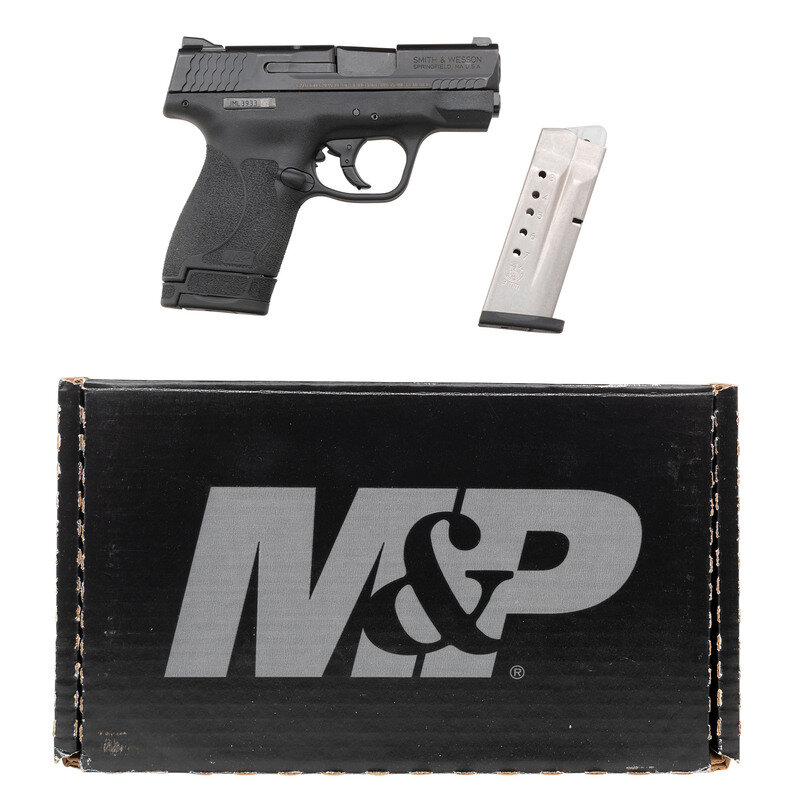 9mm Para. 3.1" barrel length. SN: JML3933. Black Armornite finish overall mounting black synthetic frame with textured grips showing M&P logo molded into butt, and M&P marked triple white dot Novak style sights. Short recoil operated striker action autoloading pistol fed by detachable double-stack magazines. Item shows standard make and model markings including M2.0 mark to the left slide. Comes in a matching cardboard box with owner's manual, cable lock in package, one eight-shot extended grip magazine and one seven-shot flush fitting magazine.