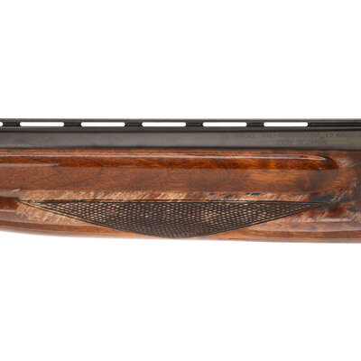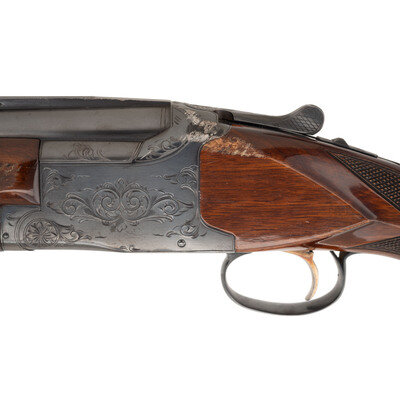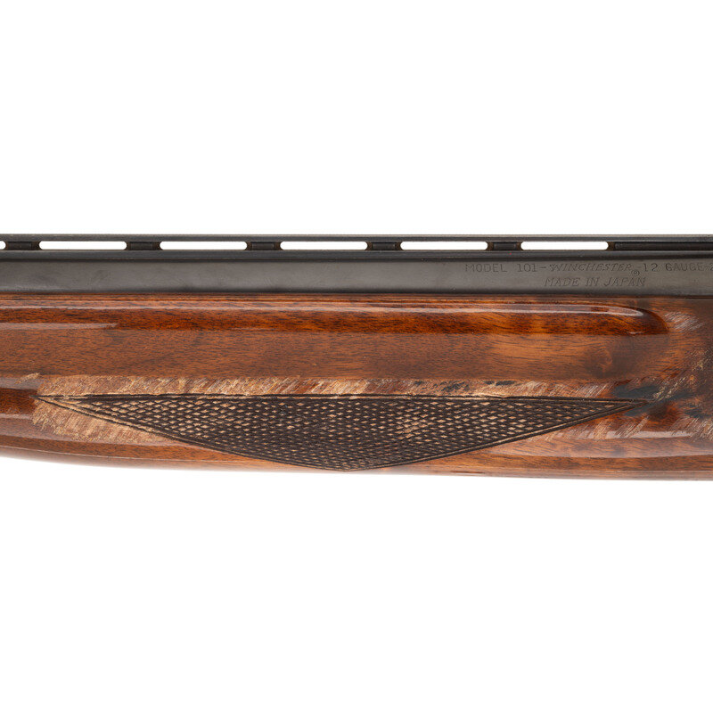 12 Gauge. 26" barrel length. SN: K129122. 2.75" chamber lengths. Modified Choke upper barrel, Improved Cylinder lower. Blued metal finish set in polished Walnut semi-pistol grip stock with bordered multipoint checkering to wrist and forend, and engraved embellishments to the frame. Double barrel over-under boxlock ejector shotgun with single trigger, and full length vented barrel rib. Sights consist of a single front bead. Stock mounts standard black synthetic WINCHESTER marked buttplate and synthetic pistol grip cap. Frame and triggerguard feature engraved spiral scrollwork with floral embellishments, along with further border engraving. Standard model marks to left barrel read MODEL-101 WINCHESTER-12 GA 2 3/4/MADE IN JAPAN with the frame marked IlnKodensha/Co.Ltd. Serial numbers match.