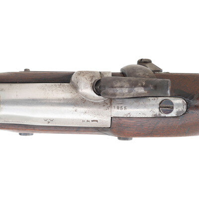 .54 caliber. 33" round barrel secured by two flat brass spring-retained bands. NSN. Originally with browned barrel, color casehardened lock and hammer, brass furniture, walnut stock. Single shot percussion muzzleloading rifle. Lock marked with a {Spred-Winged Eagle}/US forward of the hammer and in three vertical lines HARPERS/FERRY/1855 at the tail. Breech plug tang dated 1855 as well. Breech with correct small V/P/{Eagle Head} proof and an WW/P inspection mark. Counterpane with no legible inspection marks but with a weak JLR inspection inside the patchbox cut-out, the mark of Harpers Ferry Rifle Manufactory Foreman John L. Rowe. Patchbox cut-out with the three router pilot holes found on Harpers Ferry made 1841 rifle stocks. Spare cone in patchbox. Buttplate without the "US" on the tang, as is correct and with Harpers Ferry added B.39 bayonet mating mark. Muzzle face additionally stamped D10, the original bayonet mating mark. While most examples with mating marks on both the muzzle face and buttplate tang are re-alterations of previously altered guns, this one is still in the correct and original Type IB configuration. The gun retains the screw-adjustable ladder rear sight, known as the Benton Sight, the first long range adjustable sighting system to be applied to M1841 Rifles at Harpers Ferry. In the end, it was found that these were simply too fragile for field use and were equally difficult to use. As such, many Type I alterations later received sliding ladder sights to replace the Benton sight. It is also equipped with the bayonet lug with 1" guide key on the right side of the barrel, near the muzzle. The first Type I alterations received a ring bayonet. To make room for the bayonet's hilt Harpers Ferry shortened the forestock and added newly made, shorter upper barrel bands, being 2.5" long rather than 3.375". This rifle retains all the correct parts as well as the sling swivels, and a Harpers Ferry all iron ramrod that was added to some alterations for use with conical ball ammunition. A small GDM stamp is present near the buttplate in the toe of the stock to indicate ownership by the late George D Moller. According to Moller's research some 1,041 Harpers Ferry made M1841 Rifles were returned to the arsenal from the Washington Arsenal during Fiscal Year 1855 to receive the Type IB modifications of the Benton sight and saber bayonet lug. The guns were left in their original .54 caliber configuration. Some of these were later further upgraded to Type IIB rifles with the new rear sight. This is a very rare gun, almost never seen for sale and from the preeminent collection of US Military Long Arms. A correct pattern saber bayonet for this rifle is being offered in the timed online sale that accompanies this live sale.