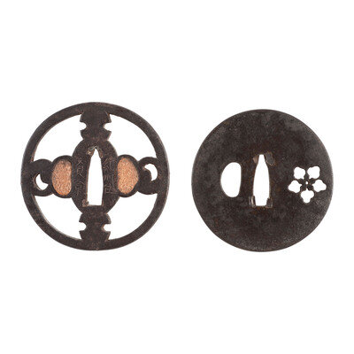 1.) Iron tsuba that is pierced with a five petal flower design, possibly in reference to the Akechi clan according to paperwork. About 2.875" diameter.