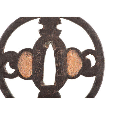 2.) Iron sukashi tsuba with copper hitsu plugs. Tsuba is pierced six times with crescent moon style workings. Item is also signed "Kishu Ju Sadanage" to one side. About 3" diameter.