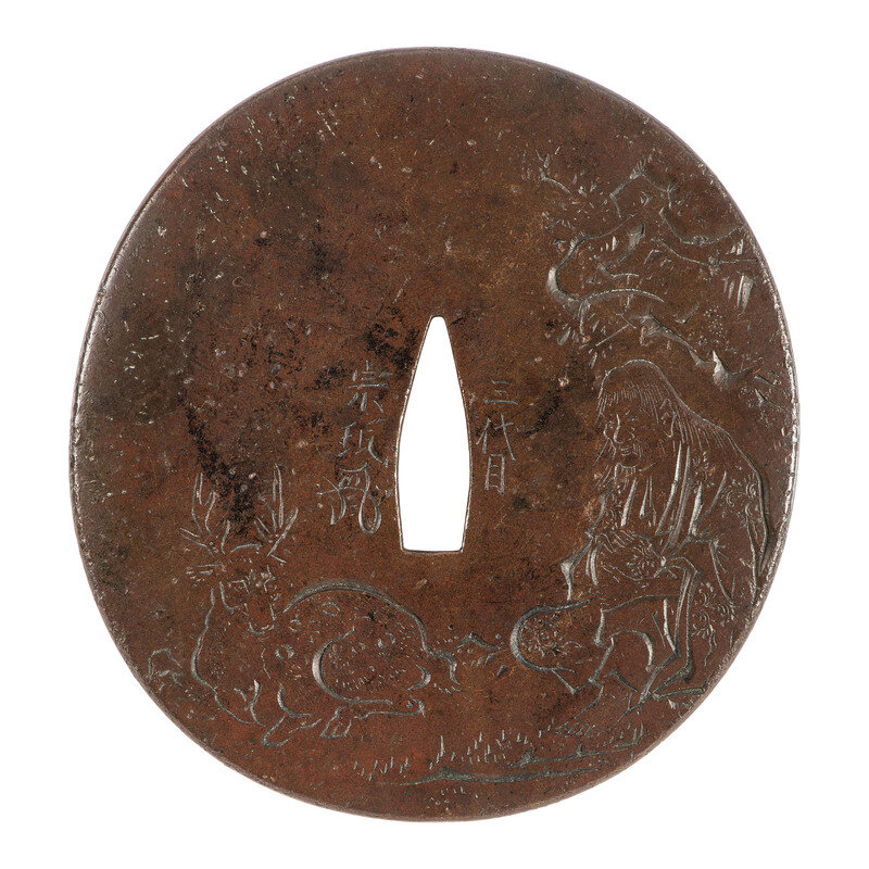3.) Copper tsuba engraved with nature scene of the Taoist god of longevity, Jurojin, with a companion deer (also a symbol of longevity). Jurojin is seen holding a peach in his hand (peaches are believed to prolong life). Tsuba is also signed with mei.