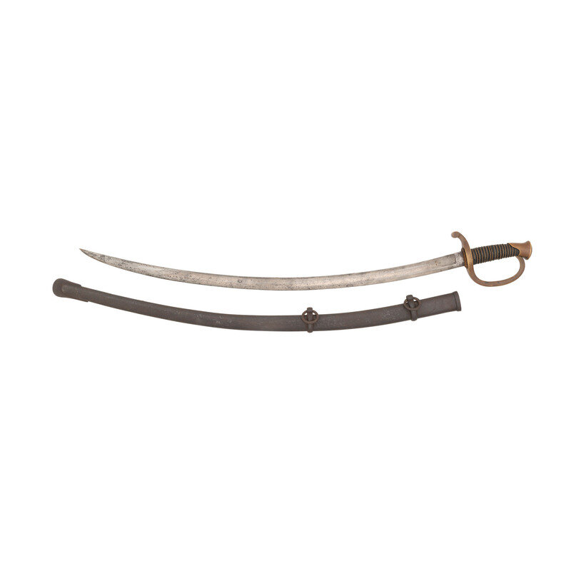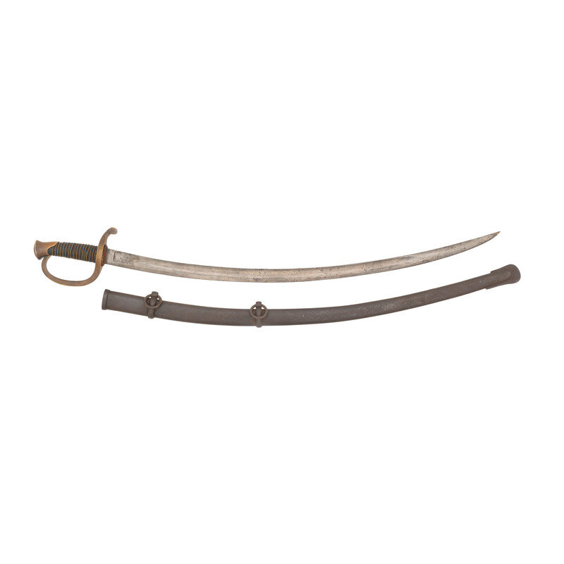 32.125" curved single edged blade with a 24.75" stopped median fuller. 37.75" in overall length. 5.75" hilt with brass guard and knuckle bow, leather covered grooved wooden grip and 16 wraps of twisted wire. Obverse ricasso marked US/MM/1864 and reverse ricasso with weak Ames maker's mark. Peen is undisturbed, pommel cap edge with JH inspection mark. Leather throat washer intact. Steel scabbard with two suspension rings, boat throat and is properly seamed along the lower edge. Scabbard with no visible inspection at drag due to pitting.