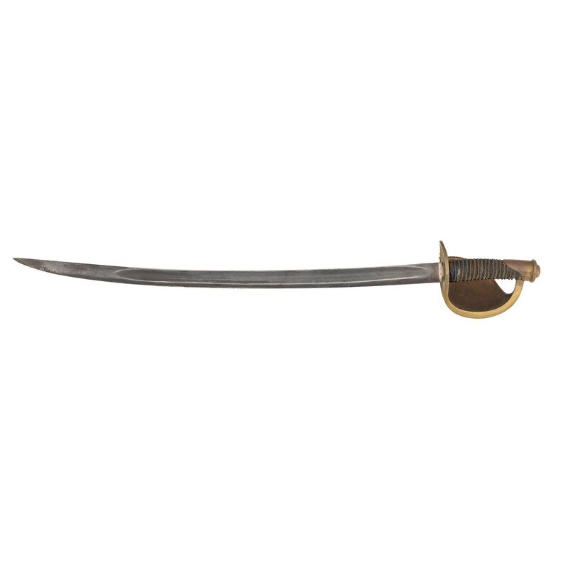 26" blade length. 31.75" overall with hilt. Curved single-edged flat backed blade with brass hilt featuring Turk's Head pommel and riveted brass cup. Right ricasso is stamped U.S.N./D.R/1862 while the guard is stamped 21M/601. Item features a leather wrapped wood hilt bound in braided wire, and is without scabbard.
