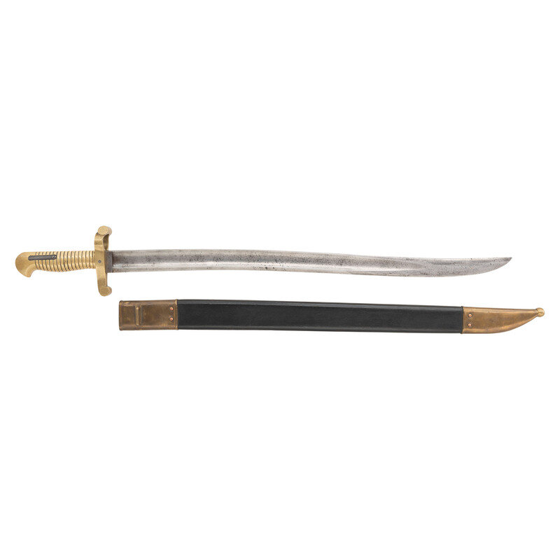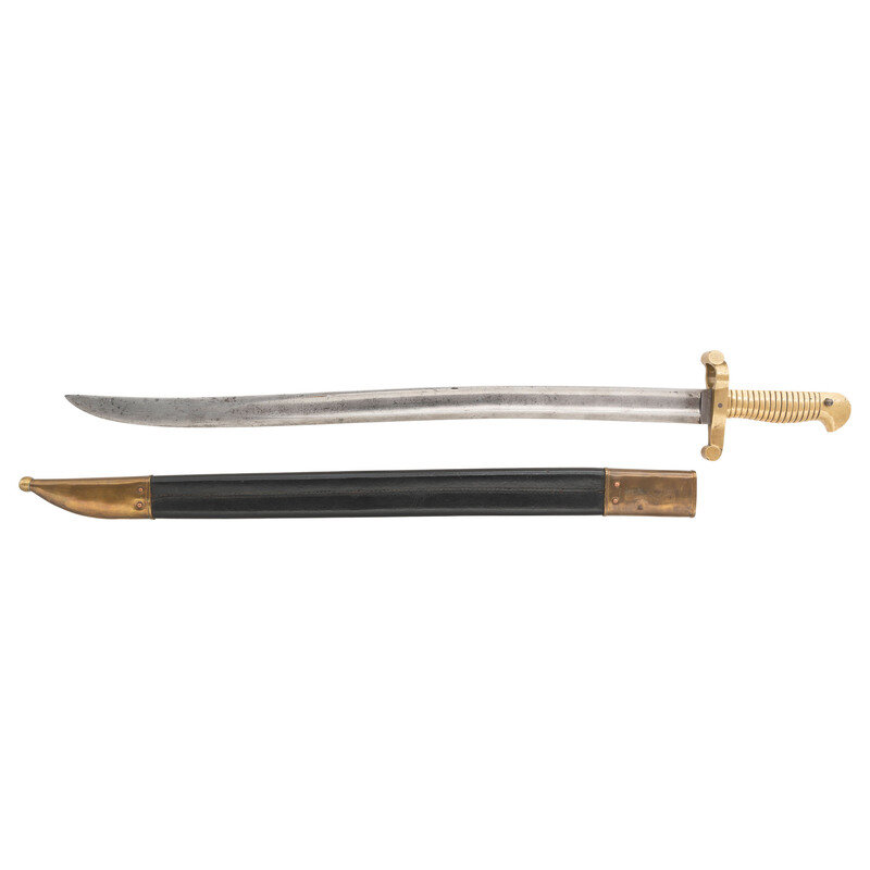 22.375" single edged semi-Yataghan blade with 17" stopped fuller. 27.25" in overall length with a 4.75" cast brass hilt palm swell and 17 grasping grooves and mounted with a 4" crossguard with a disc quillon on the lower guard and a cock's comb on the muzzle ring. Blade reinforced with a large steel pin in the hilt and with a Harpers Ferry PB/P inspection stamp on the obverse ricasso. A small S inspection is present immediately behind the guard on the top right of the grip and a larger B inspection is present on the top of the grip. The mortise cut in the hilt is cut for 1" guide key as found on Harpers Ferry Type I 1841 Rifle alterations modified from the "Snell" ring bayonet system and for Type II Harpers Ferry 1841 Rifle alterations. A very fine correct pattern brass mounted leather scabbard accompanies the bayonet.