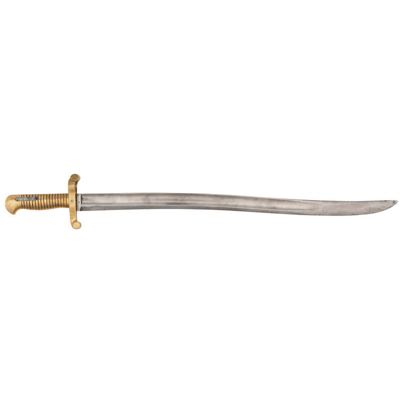 22.25" single edged semi-Yataghan blade with 16.75" stopped fuller. 27.125" in overall length with a 4.875" cast brass hilt palm swell and 18 grasping grooves and mounted with a 4" crossguard with a disc quillon on the lower guard and a cock's comb on the muzzle ring. Blade reinforced with a large steel pin in the hilt and with a Harpers Ferry PB/P inspection stamp on the obverse ricasso. A small U inspection is present on the top of the grip. The mortise cut in the hilt is cut for 1" guide key as found on Harpers Ferry Type I 1841 Rifle alterations modified from the "Snell" ring bayonet system and for Type II Harpers Ferry 1841 Rifle alterations.