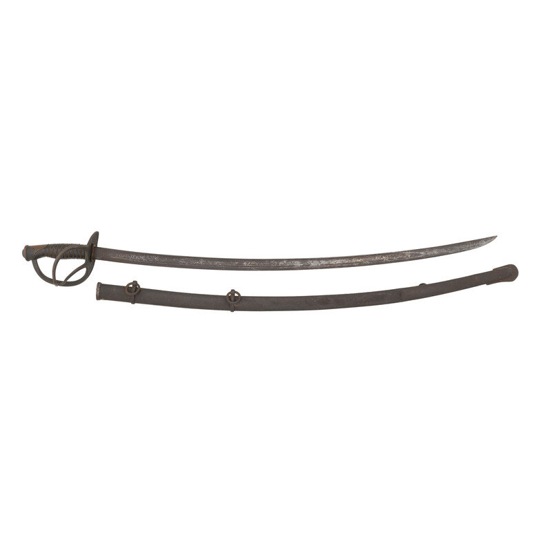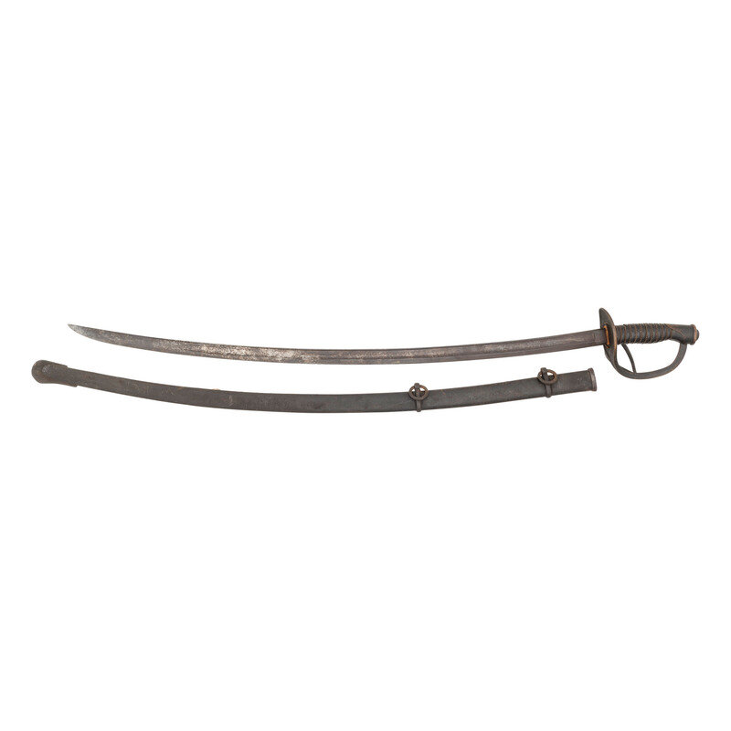 34.5" blade length. 42.25" overall with scabbard and hilt. Curved single edged sword with 7" false edge and double fullers. Item mounts a brass hilt with two branches connecting to the knuckle bow, a turkshead pommel, and leather wrapped grips with braided wire binding. Comes in a steel scabbard with two hangers. Right ricasso is struck U.S./D.R/1863 on the right side and displays manufacturer mark reading AMES MFG CO/CHICOPEE/MASS to the left. Scabbard is unmarked.