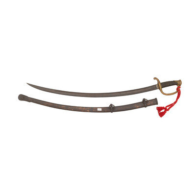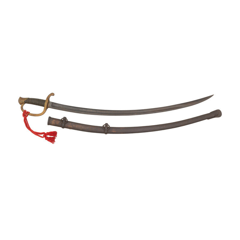 32" blade length. 39.25" overall with scabbard and hilt. Curved single edge sword with flat back and single fullers, a 6" false edge, and brass guard with knuckle bow and Turkshead pommel. Item is marked U.S/J.C.W./1865 on the right ricasso with maker mark to the left reading Made by/AMES MFG CO/CHICOPEE. Guard marked JW on the left side and JWW on the right, the latter letter having been double struck. Scabbard is steel with double hangers.