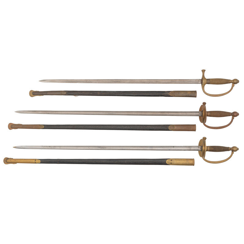 1.) Pair of Model 1840 NCO Swords. Items feature 32" blade lengths. 39.5" overall with scabbards and hilts. Straight single edged blades with single fullers, spearpoint tips, and mounting cast brass hilts with clamshell guards and knuckle bows. Items feature peened tangs and come in leather scabbards with brass throats and drags. One sword is struck US/1862 to the right ricasso and Made by/AMES MFG CO/CHICOPEE/MASS, and further is marked with a K initial to the knuckle bow. The other sword is marked U.S/T.K.I/1864 on the right ricasso and Made by/AMES MFG CO/CHICOPEE/MASS to the left. Knuckle bow of this example marked JH.