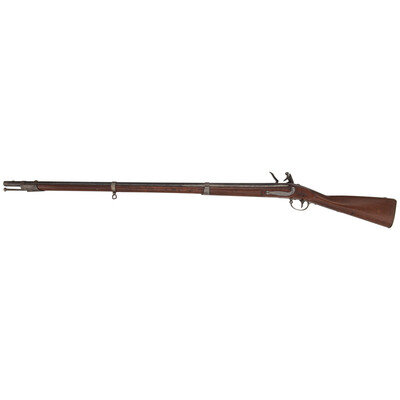 .69 caliber. 42" barrel secured by three flat, spring retained bands. NSN. Bright finish, steel furniture, walnut stock. Single shot muzzleloading smoothbore flintlock military musket with no rear sight and brass blade front sight. Lock remains in original flint with all internal parts showing matching mating marks, as does the cock, pan, frizzen and external lock screws. Lock marked W.L. EVANS/{Spread-Winged Eagle}/V FORGE in three horizontal lines under the pan and US/1830 in two vertical lines at the tail. Breech with George Flegel's GF/P/US inspection marks. Weak script Luther Sage LS cartouche on counterpane. Missing lower swivel, upper swivel present. Forend spliced at middle band, ramrod is a reproduction of the correct type.