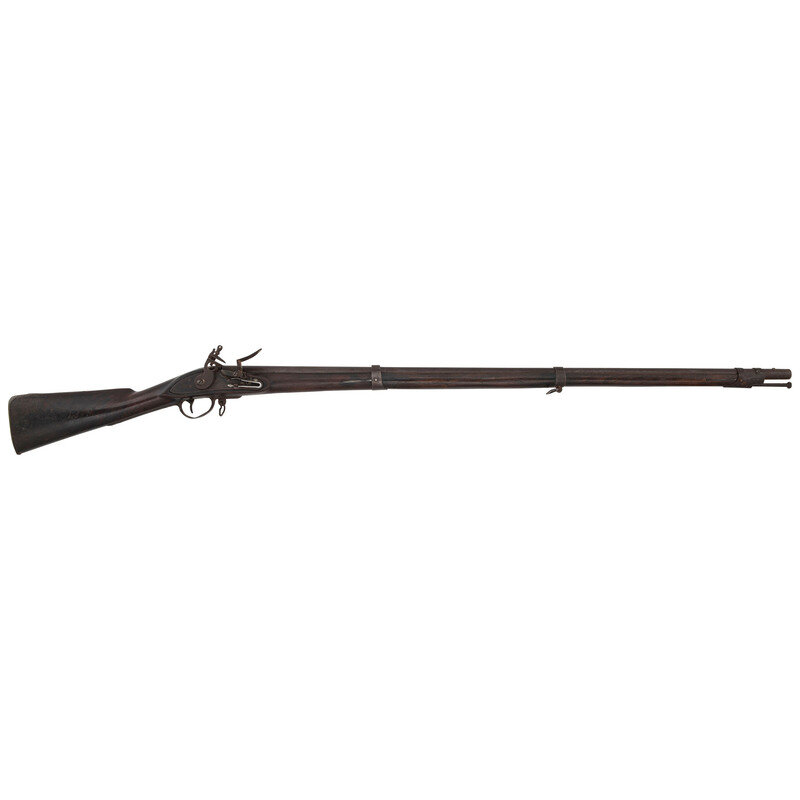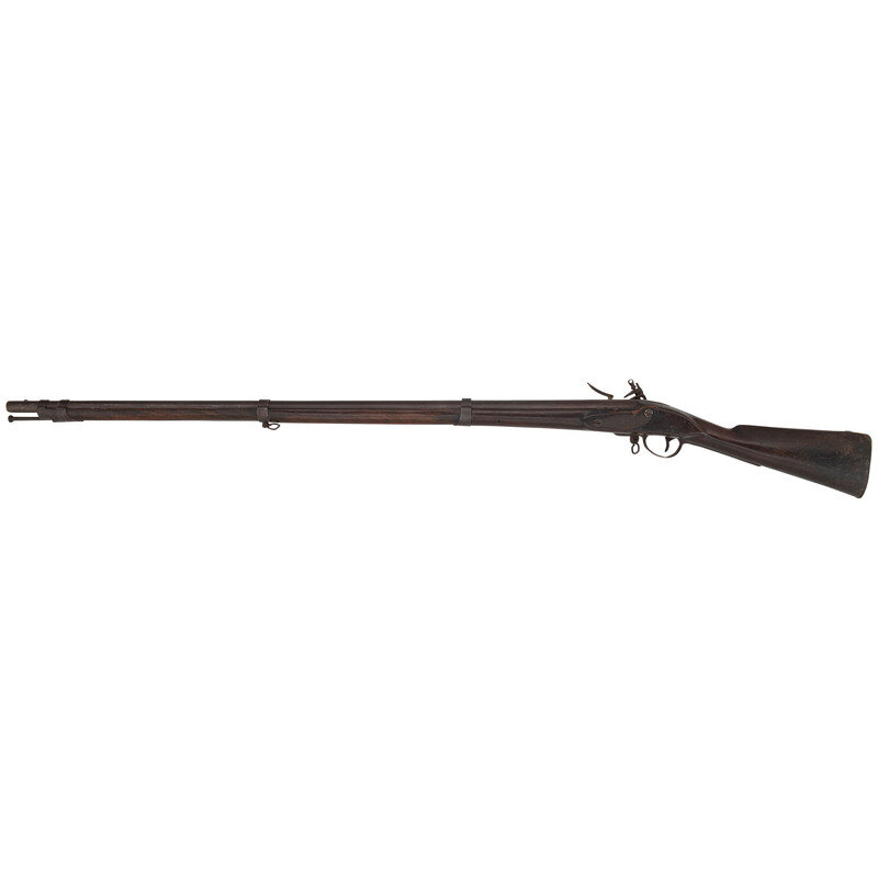 .69 Cal. 42" barrel length. SN: NSN. Brown patina overall in varnished walnut straight grip stock with full length handguard and mounting front blade sight affixed to the barrel. Single shot flintlock smoothbore musket comes with an iron ramrod and furnishings. Item features three barrel bands with sling loops to the middle band and on forward trigger plate. Lockplate is marked S.CT forward of the cock, and mounts a replaced frizzen spring. Touch hole sits low in the pan suggesting the latter has been replaced or refitted. Barrel shows some irregular pits and surface suggesting it may have been rebuilt to flint. Barrel is marked S. CT S.I. 1813 with P and M initials partly hidden by counterpane. Stock has rounded edges indicative of sanding at some point.