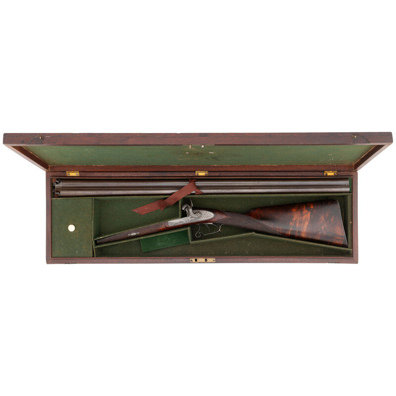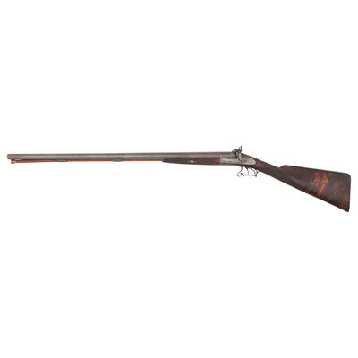 12 Gauge. 30" blade length. SN: NSN. Browned Damascus steel barrels and gray finished locks set in a walnut straight wrist stock with splinter forend featuring bordered checkering to the wrist and forend. Double barrel side by side percussion shotgun featuring scroll engraved embellishments to the lockplates. Right lockplate is engraved JOHN WURFFLEIN with the left displaying PHILADELPHIA. An accompanying mark on the barrel rib reads JOHN WURFFLEIN PHILADELPHIA. Barrel maker mark reads E.BERNARD/CANNONIER DE PARIS with {Crown/EB} stamps below both breeches. Lockplates feature bank note scroll engraving of {Pointers in Thickets} below maker marks enclosed by spiral scroll engraving at the forward and rear ends of the lockplates. Hammers feature spiral scroll along the flanks with fishmouth engraving on each hammer. A gold escutcheon to the wrist is engraved Thomas B. Rayner/1867/Veterinary Surgeon. Item comes with a wood ramrod with brass tip, and comes in a wood box with green felt liner with nameplate to the lid marked S. Setchell.