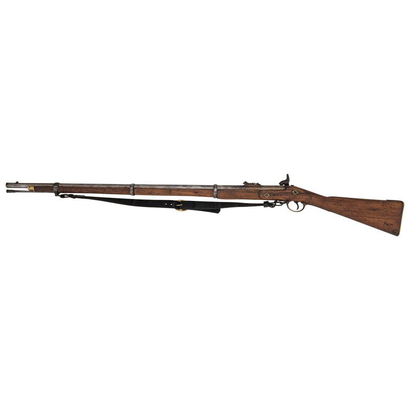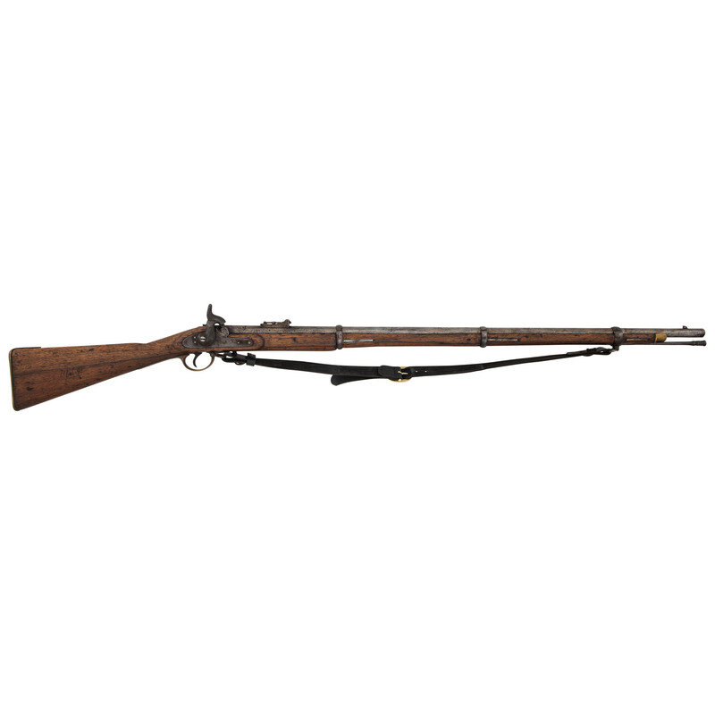 .63 Cal. 39" barrel length. SN: NSN. Finished in the white with straight wrist wood stock featuring a brass buttplate and iron barrel bands, and adjustable rear ladder and front blade sights. Single shot percussion smoothbore musket following the design of a Pattern 1853 Enfield Rifle Musket. Tang, sight, and trigger plate show Nepalese markings. Item comes with a reproduction leather sling.