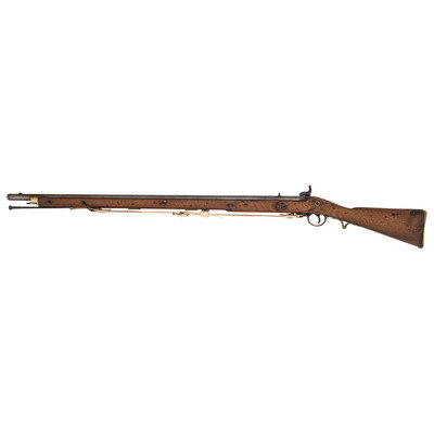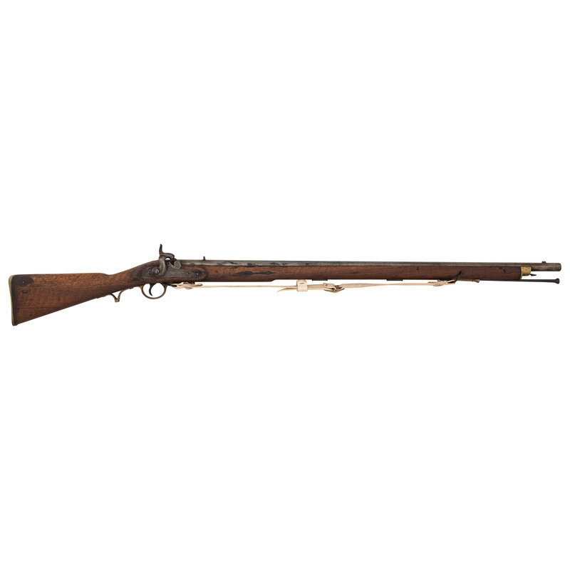 .74 Cal. 39" barrel length. SN: NSN. Finished in the white with walnut straight wrist stock mounting brass fittings and a pinned stock. Single shot percussion smoothbore musket with fixed rear notch and front blade sights. Lockplate is marked with the {Rampant Lion} of the East India Company. Barrel struck 2/8 to the right flank with the left showing {Crown/V} and {Crown/GP} London proof markings. Handguard nosecap features spring-catch for mounting a bayonet, and a front sight doubling as the lug. Wood is unmarked and has been sanded. Comes with a reproduction sling.