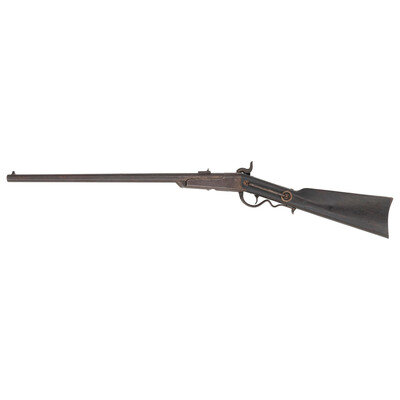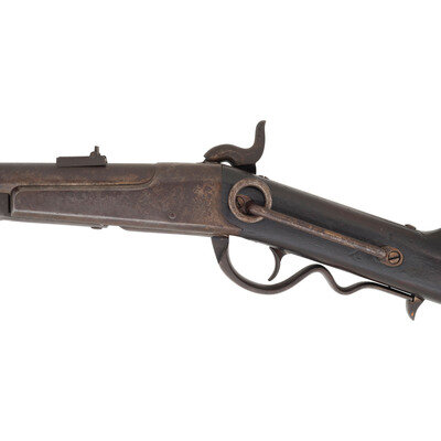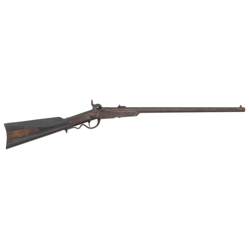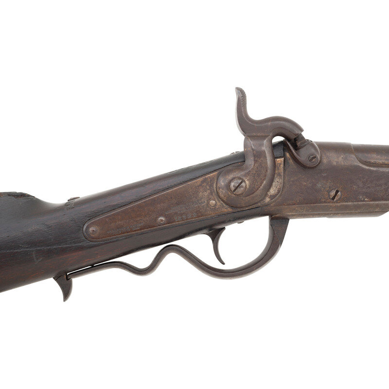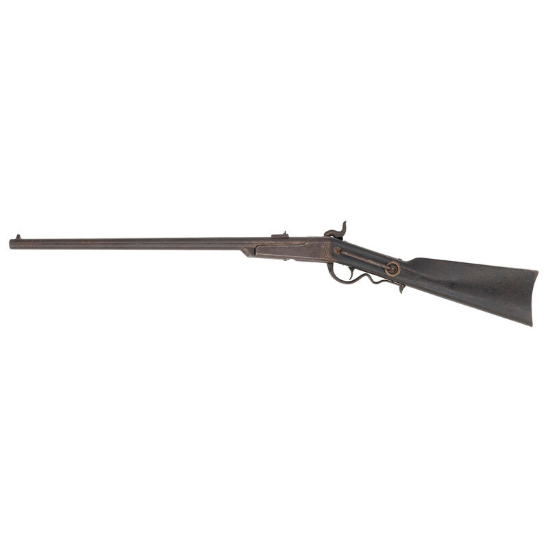 .52 Cal. 22" barrel length. SN: 16322. Brown patina overall mounting walnut straight wrist stock with patchbox to the right butt, and mounting two position rear notch and front blade sights. Single shot breechloading percussion rifle with spring catch to the lever. Lockplate is marked MANUFACTD BY/RICHARDSON & OVERMAN/PHILADA behind the hammer, and further struck GALLAGER'S PATENT/JULY 17TH 1860. Stock mounts saddle bar and ring to the left wrist. Stock is hand carved with cruciform embellishments.