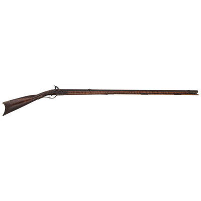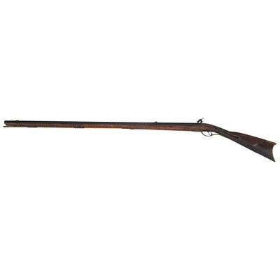 .45 Cal. 39.75" barrel length. SN: NSN. Deep brown patina overall with brass fittings to full length maple stock with straight wrist and cheek rest to left stock. Single shot percussion converted rifle with fixed rear notch and front blade sights on an octagonal to round barrel. No visible maker mark to the barrel. Lock displays two line border engraving to the lockplate with wheat chaff engraving to the hammer and forward of the hammer. Percussion drum does not fit flush with the lock, suggesting the rifle was converted from flint to percussion. Excessive curvature to the hammer suggests it may have been modified from a flint cock.