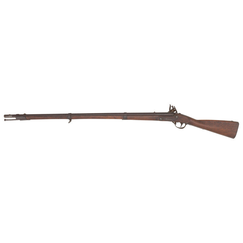 .69 Cal. 42.125" barrel length. SN: NSN. Brown patina overall in walnut straight wrist full length stock with three barrel bands, and upper band blade with fixed rear notch sights. Single shot smoothbore muzzle loading flintlock with iron ramrod, and bayonet lug to upper barrel. Lockplate is marked NEW/HAVEN/1836 behind the cock and U.S./{Crossed Arrow and Olive Branch}/E. WHITNEY. Item features a brass pan, flint with leather to the jaws, and sling loops to triggerguard and middle barrel band. Barrel marked LS US/P and is dated 1830 or 1839 to the tang. Buttplate marked US. Counterpane shows the circled LS cartouche of inspector Luther Sage.