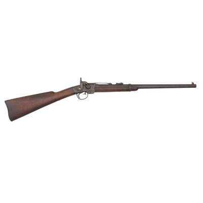 .50 Cal. 21.675" barrel length. SN: 7191. Blued finish with case colored frame mounting walnut straight grip stock with half length upper handguard secured by a single barrel band. Single shot breechloading percussion carbine with octagonal to round barrel and saddle ring and bar to the left frame. Item mounts an adjustable ladder rear and replacement red painted N-SSA shooter front sights. Left frame is marked ADDRESS/POULTNEY & TRIMBLE./BALTIMORE. U.S.A. and SMITH'S PATENT/JUNE 23. 1857. Further marked AM'N M'CH'N WKS/SPRINGFIELD MASS. Left wrist is struck GP, and the left barrel flat shows B and P markings.