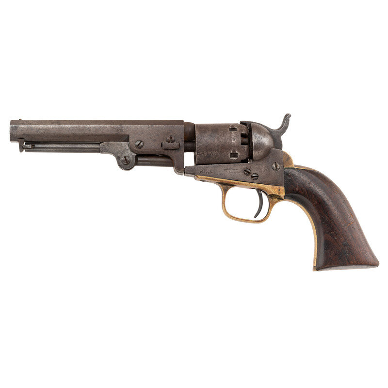 .31 Caliber. 5" barrel. SN: 175776 (mfg. ca.1860). Blued finish with case colored frame featuring brass gripstraps and one piece varnished walnut grips. Single action five-shot percussion revolver with octagonal barrel and round triggerguard. Serial numbers are mixed with the frame components and arbor pin matching the above number, and the cylinder, wedge pin, and lever matching 29649. Barrel serial number has been force matched to the frame. Barrel struck with a bracketed two-line address reading ADDRESS SAML COLT/NEW YORK CITY, while the left frame is struck COLTS/PATENT. Inspector initials N and S appear on the triggerguard. Grips with rounded edges indicative of sanding.