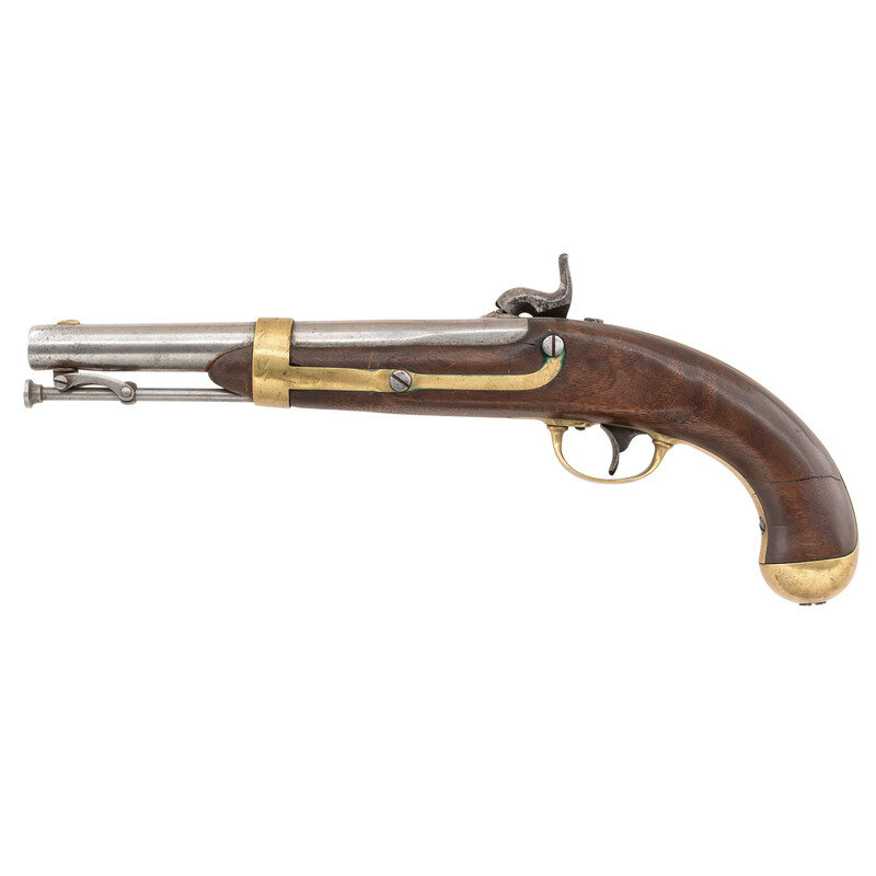 .54 Cal. 8.5" barrel length. SN: NSN. Buffed bright finish to steel components with brass furnishings set in walnut stock and featuring a brass blade front sight and iron swivel ramrod. Single shot percussion pistol with smooth bore. Lockplate is marked US/H.ASTON forward of the hammer and MIDDTN/CONN./1847 behind it. Item shows a faint M inspector mark to the barrel flat. Stock has been sanded and is without cartouches. Hammer screw appears to have been replaced.