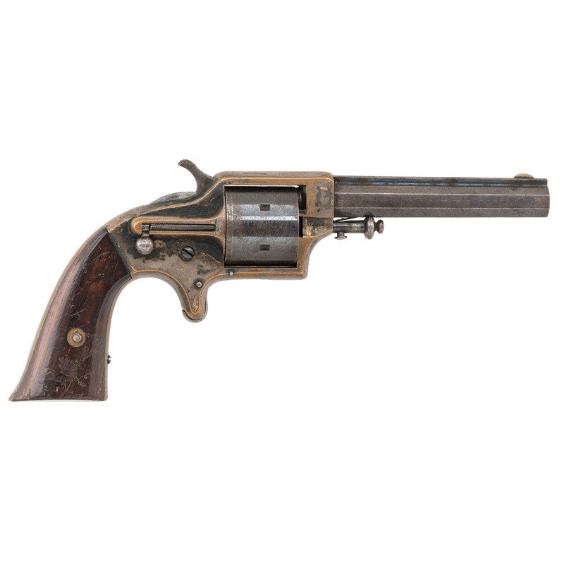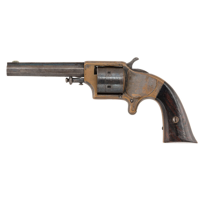 .30 Cup Fire. 3.5" barrel. SN: 2390. Blued metal finish with silver plated brass frame mounting varnished rosewood grips and featuring a German Silver front blade and topstrap notch rear sights. Single action six-shot cup-fired loading gate revolver with spur hammer and hand operated ejector to right recoil shield. Item features an octagonal barrel with fluted barrel rib showing a single line address reading EAGLE ARMS CO NEW YORK. Cylinder is marked with two patents in a single line reading PATENTED. JULY 12. 1859 & JULY 21. 1863. Butt is marked with the initials APC. Serial numbers match on the butt and on the grip panels. Item is missing the cylinder stop.